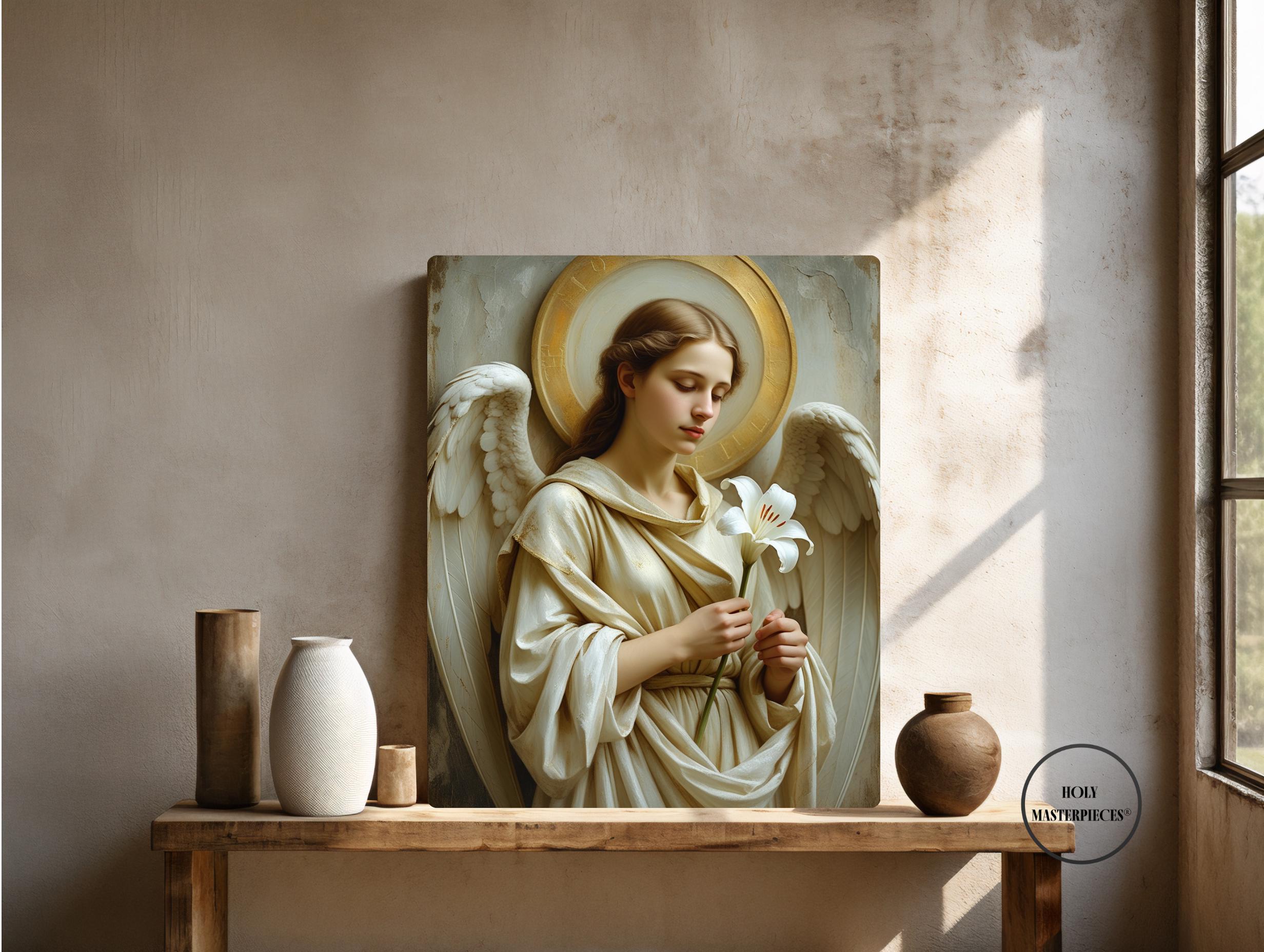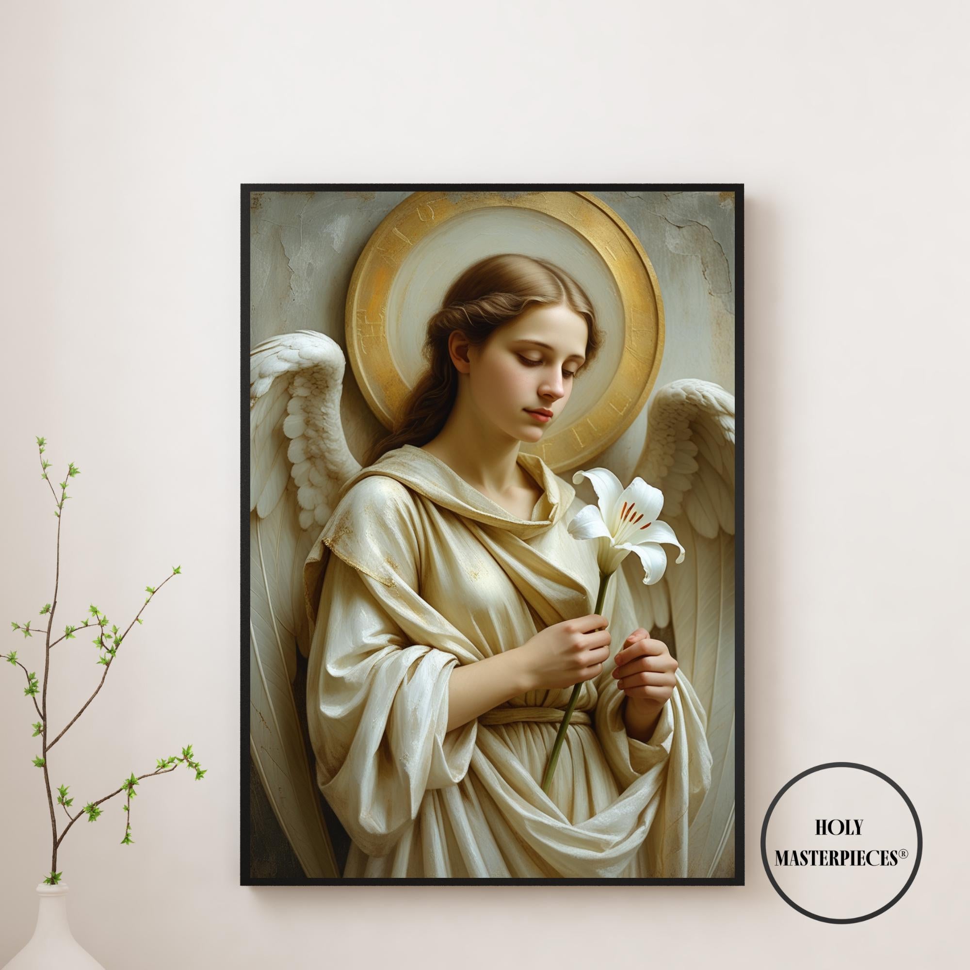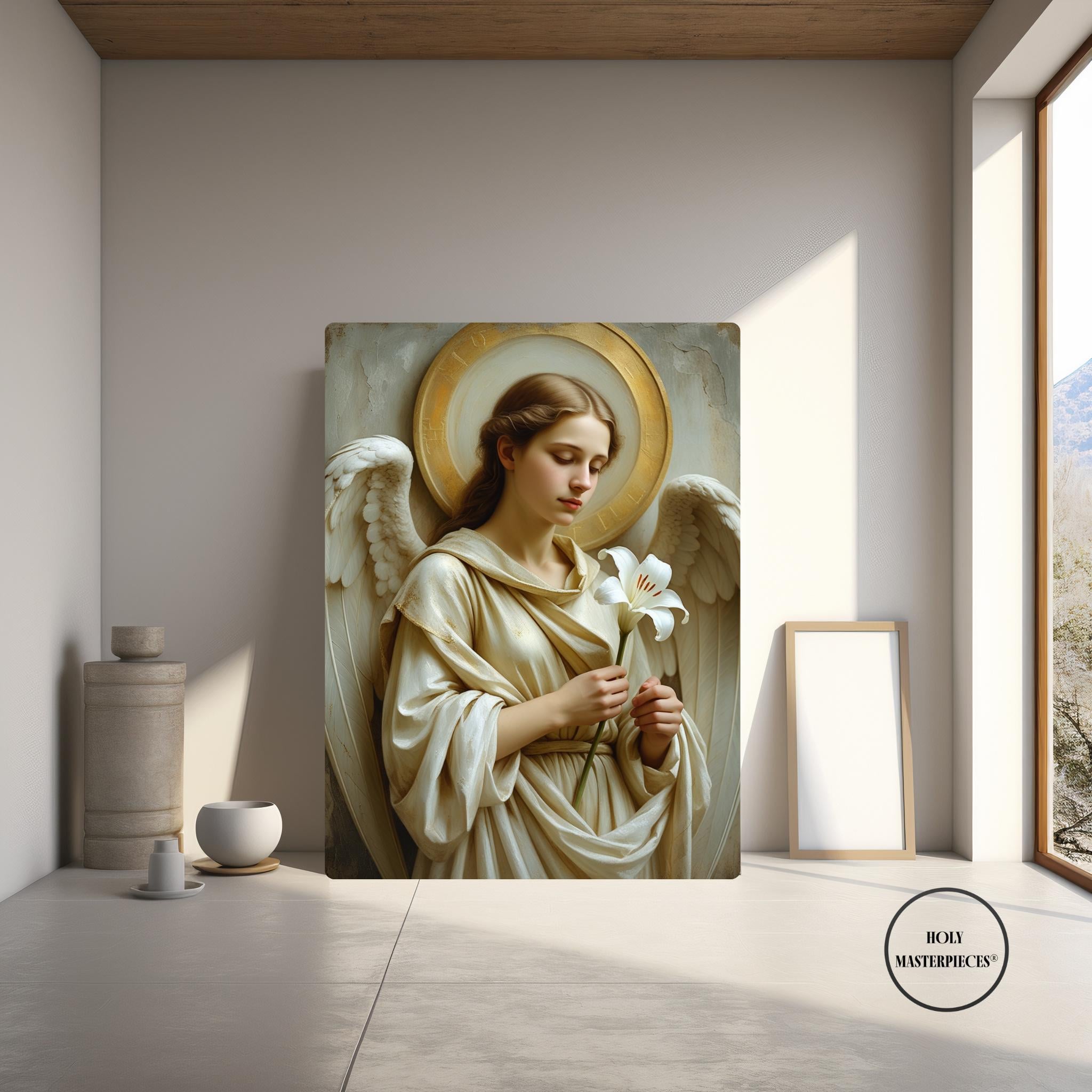 Lily of the Annunciation presents Archangel Gabriel in a moment of quiet contemplation, holding a white lily traditionally associated with purity, divine message, and the Annunciation. Rather than dramatic proclamation, the figure is rendered with a gentle, inward posture and lowered gaze, conveying reverence, obedience, and serene devotion. The lily becomes the central focal point within this refined Archangel Gabriel Catholic wall art composition.