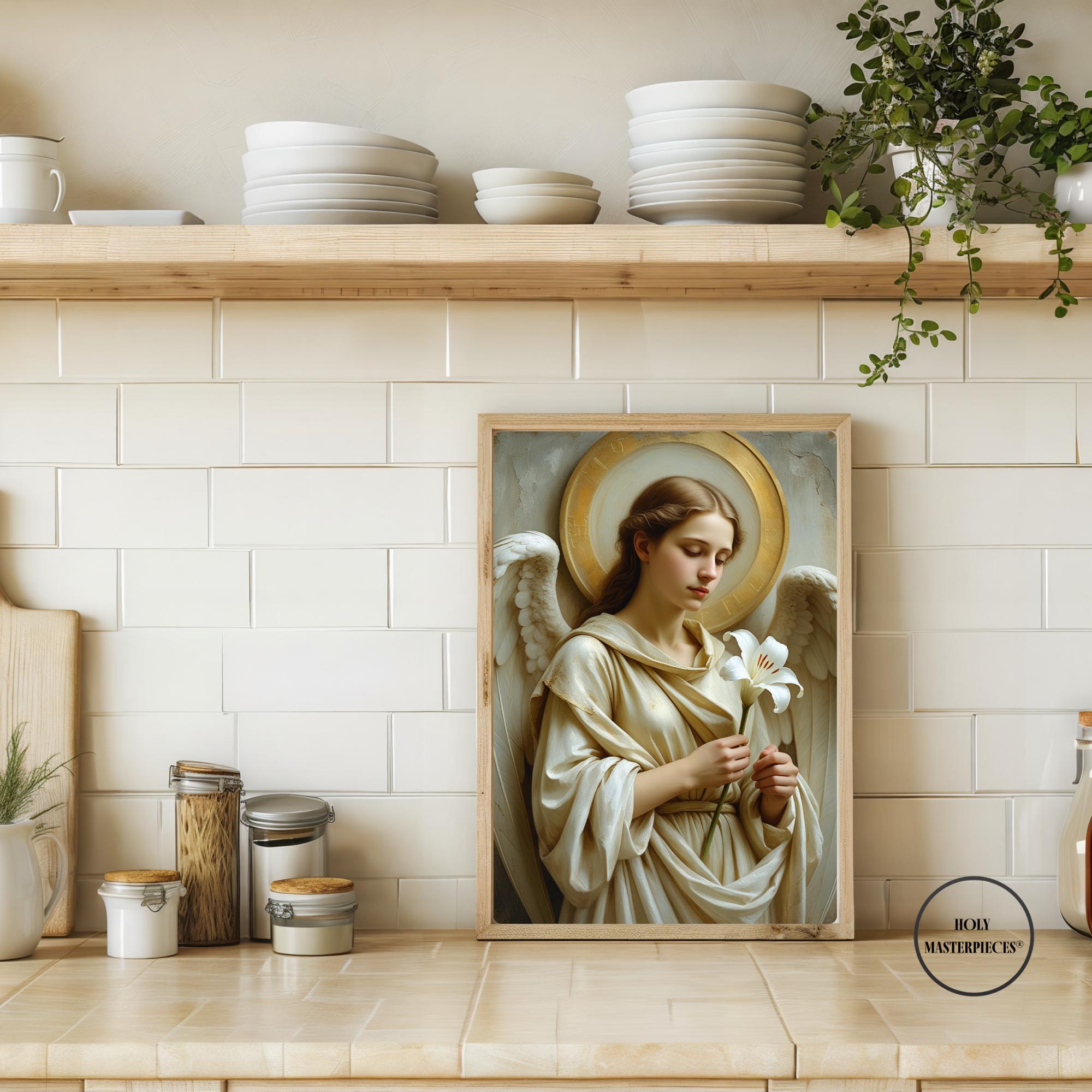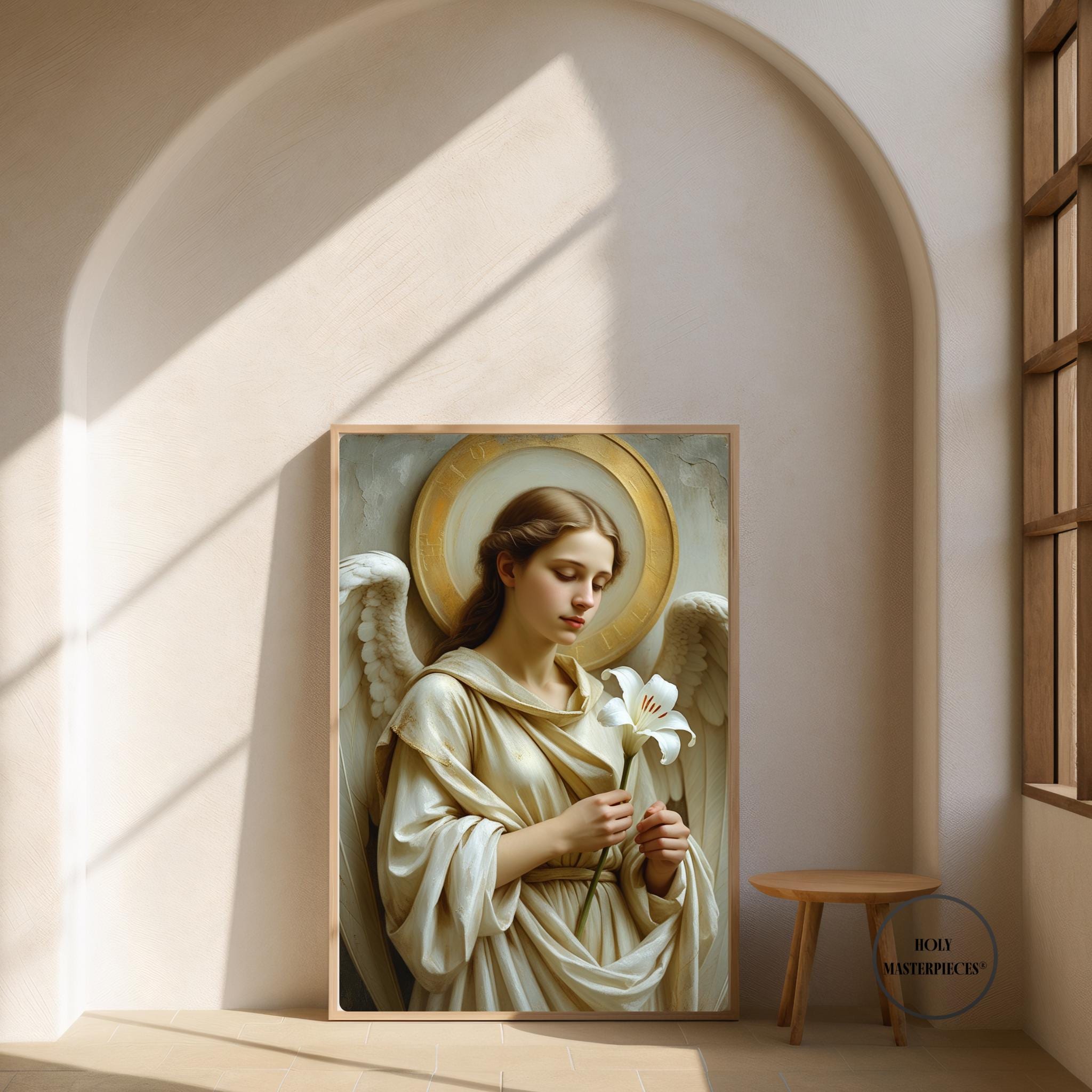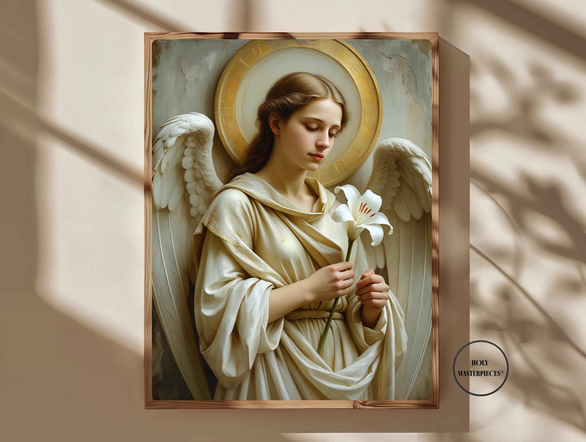 Lily of the Annunciation presents Archangel Gabriel in a moment of quiet contemplation, holding a white lily traditionally associated with purity, divine message, and the Annunciation. Rather than dramatic proclamation, the figure is rendered with a gentle, inward posture and lowered gaze, conveying reverence, obedience, and serene devotion. The lily becomes the central focal point within this refined Archangel Gabriel Catholic wall art composition.