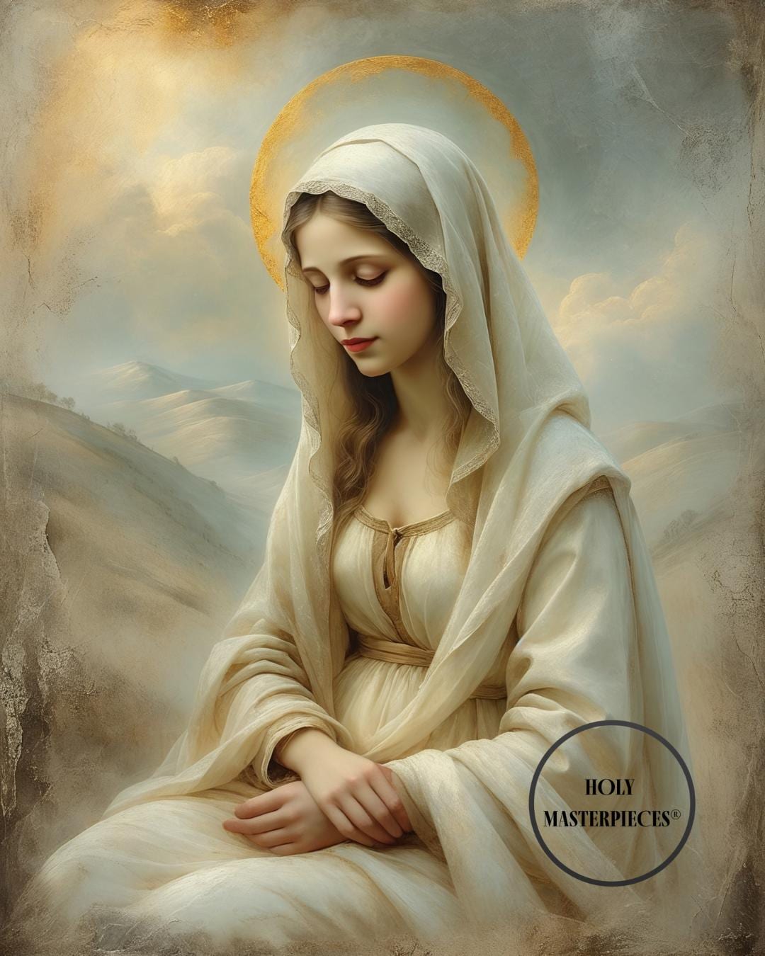 A serene and contemplative portrayal of the Blessed Mother, painted in the gentle, devotional style of 17th-century sacred oil artwork. Soft morning light settles across the distant hills as Mary sits in peaceful stillness, her lowered eyes radiating humility and grace.