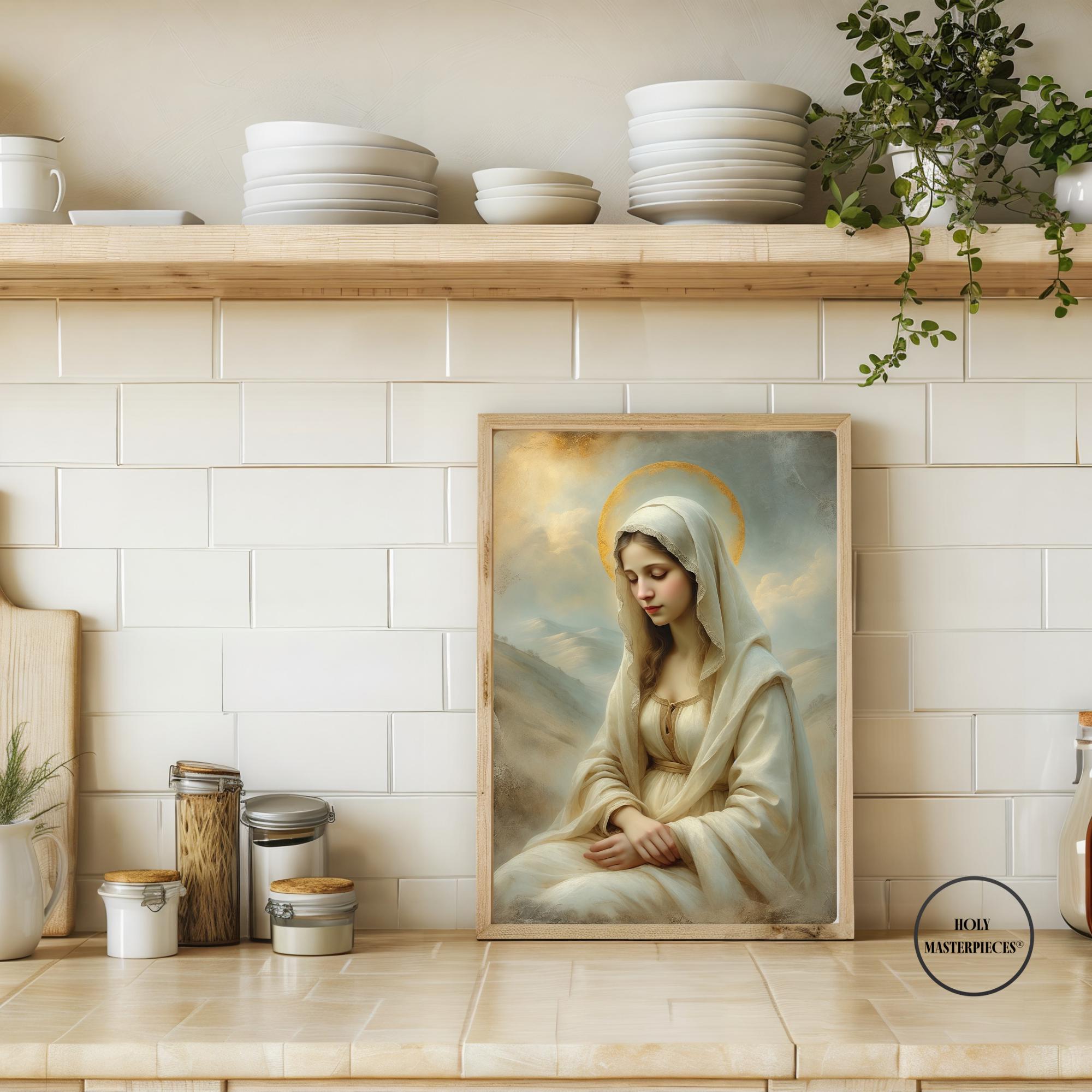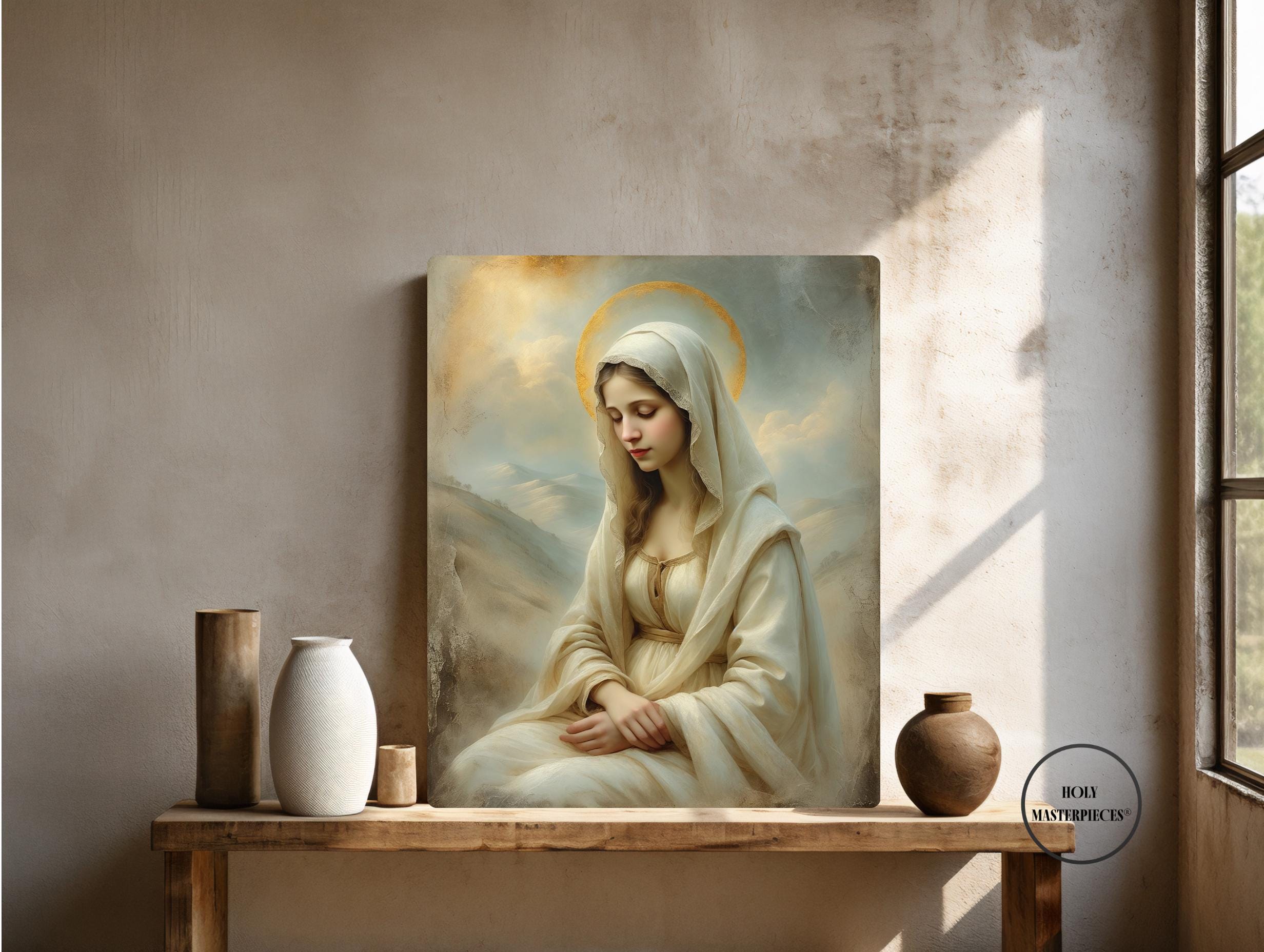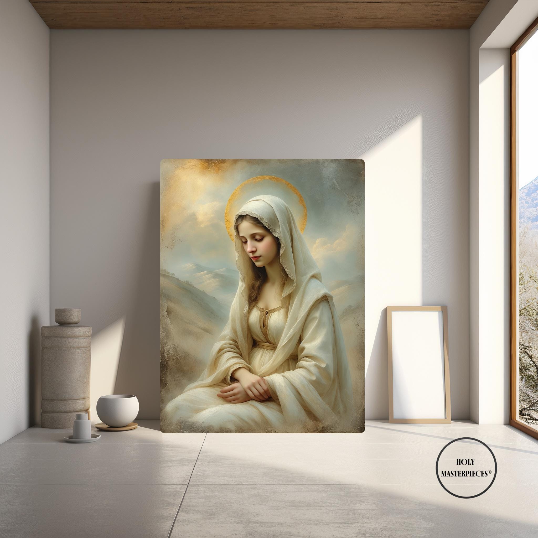 An uplifting and prayerful artwork perfect for chapels, Marian devotion, prayer corners, and peaceful Christian home décor.