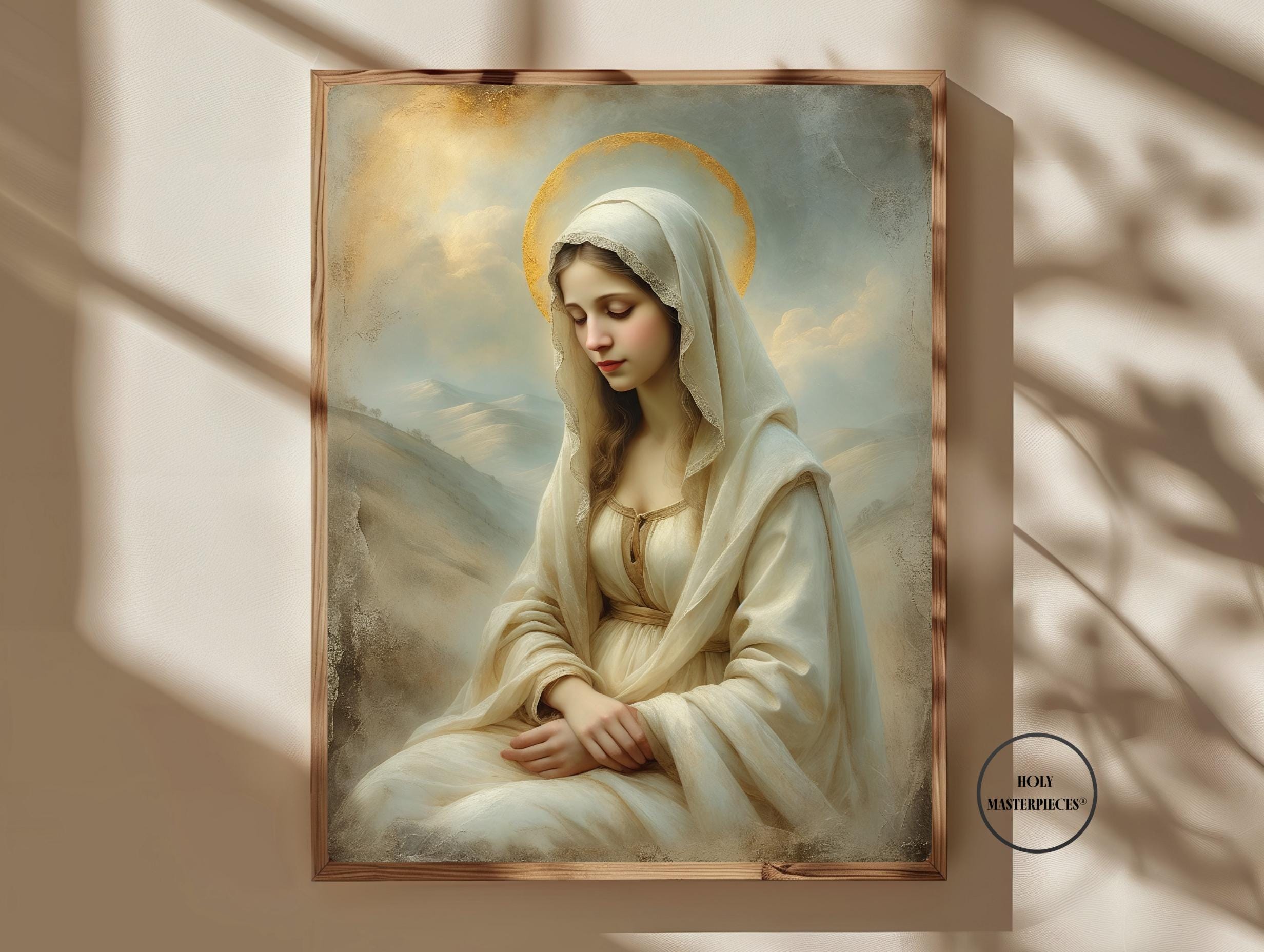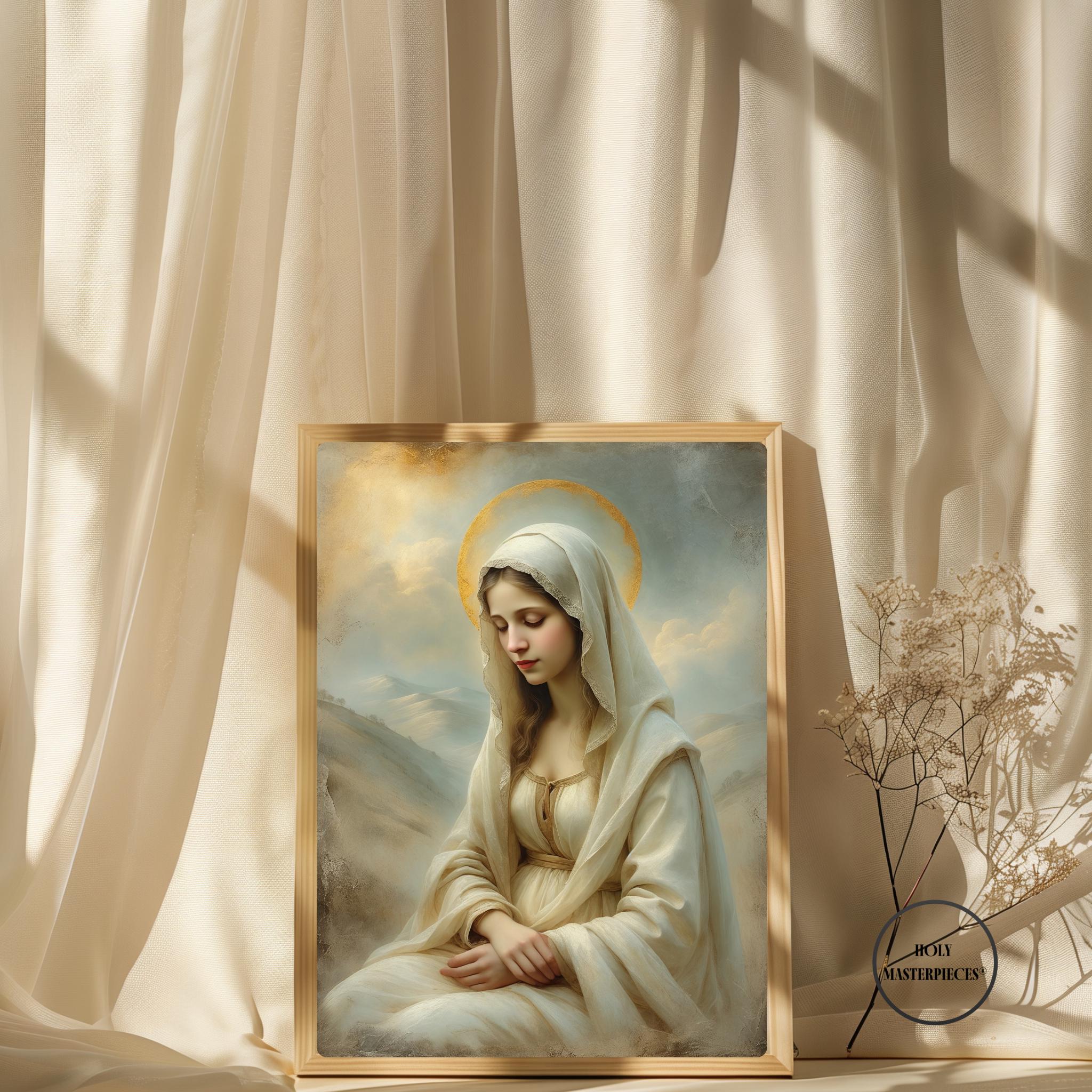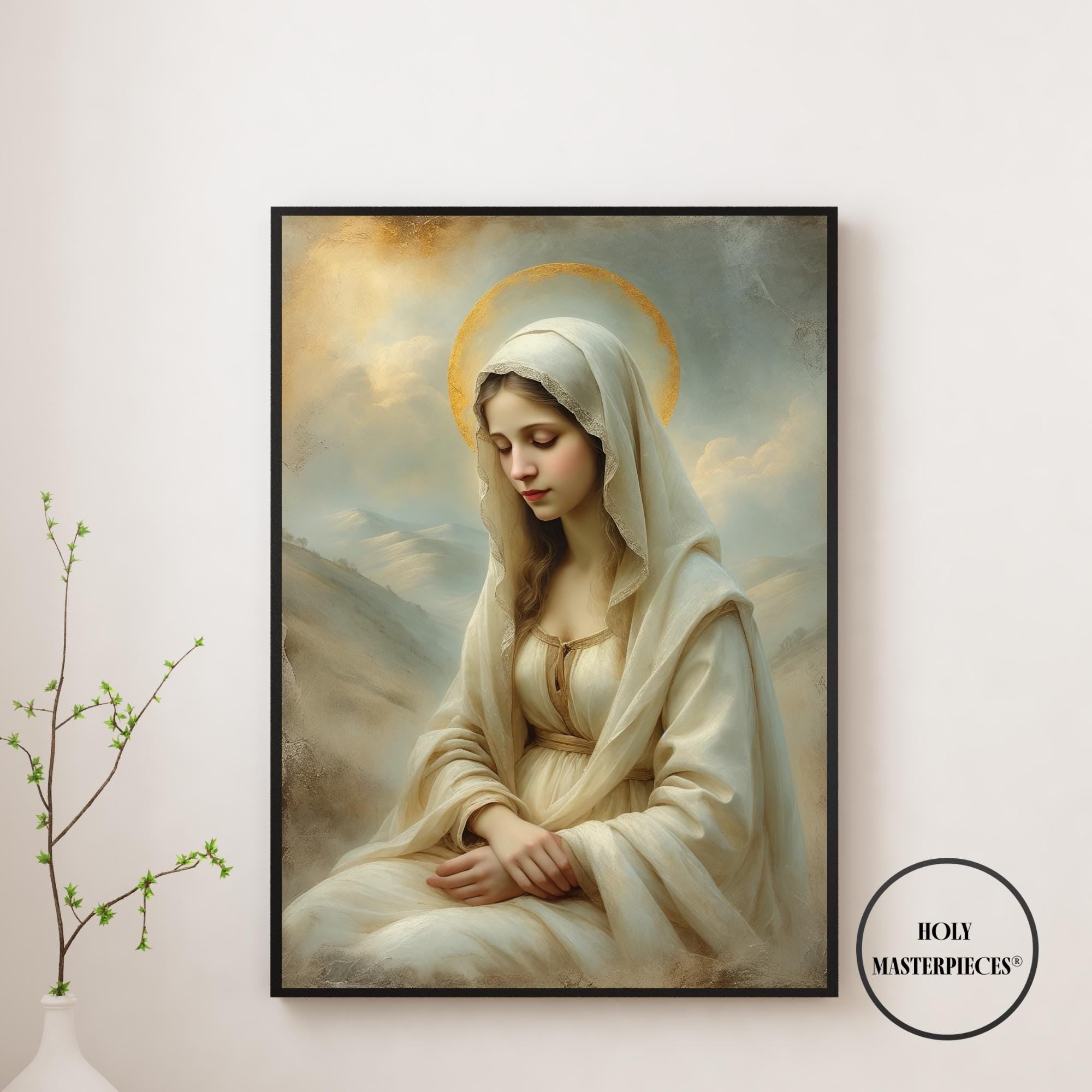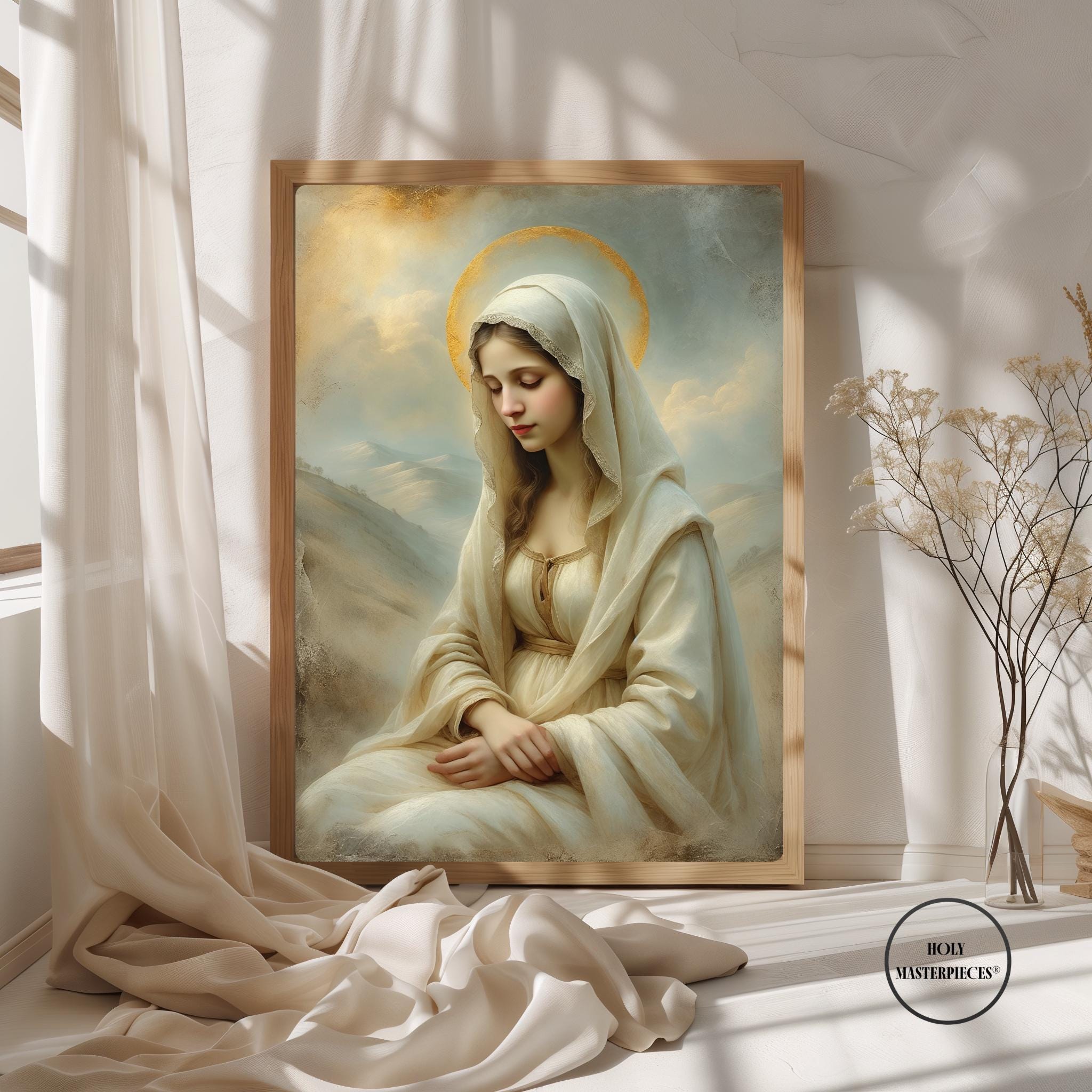 An uplifting and prayerful artwork perfect for chapels, Marian devotion, prayer corners, and peaceful Christian home décor.