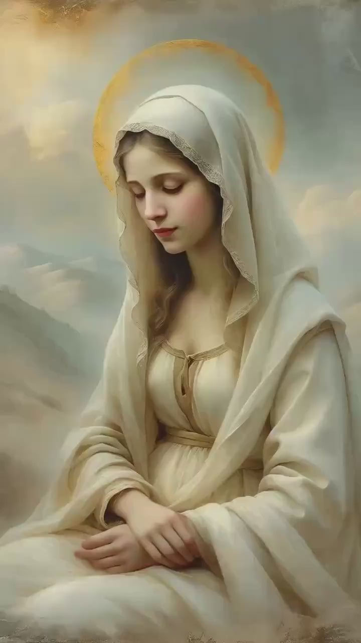 Her flowing ivory garments, delicate veil, and the textured cracked-plaster background create a timeless sacred atmosphere reminiscent of ancient frescoes.