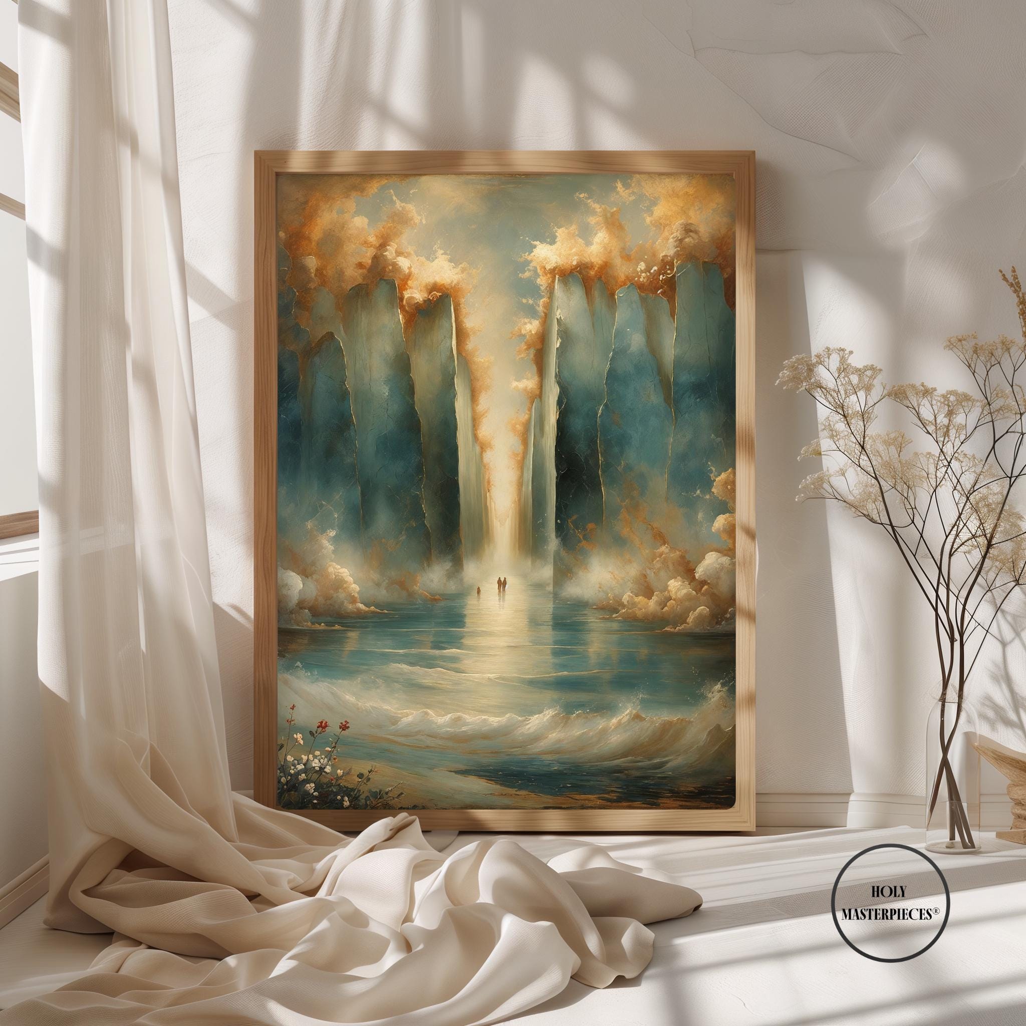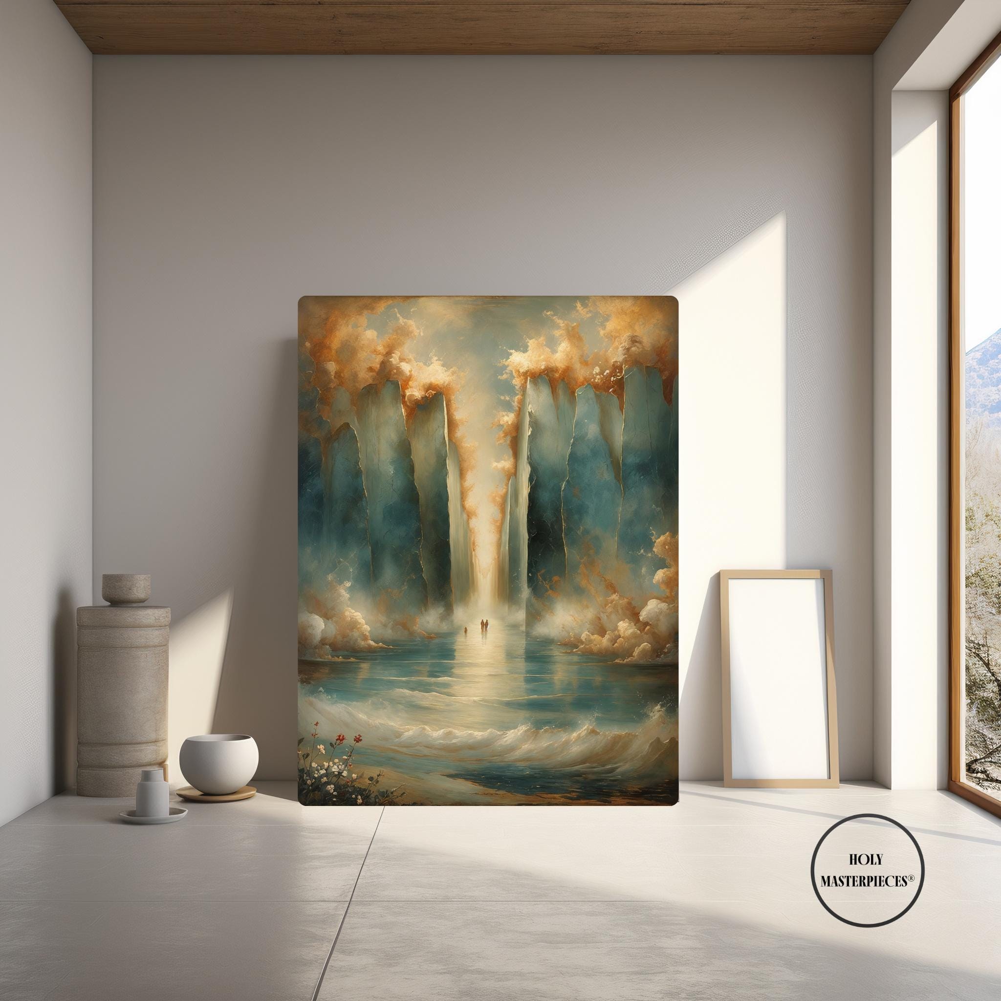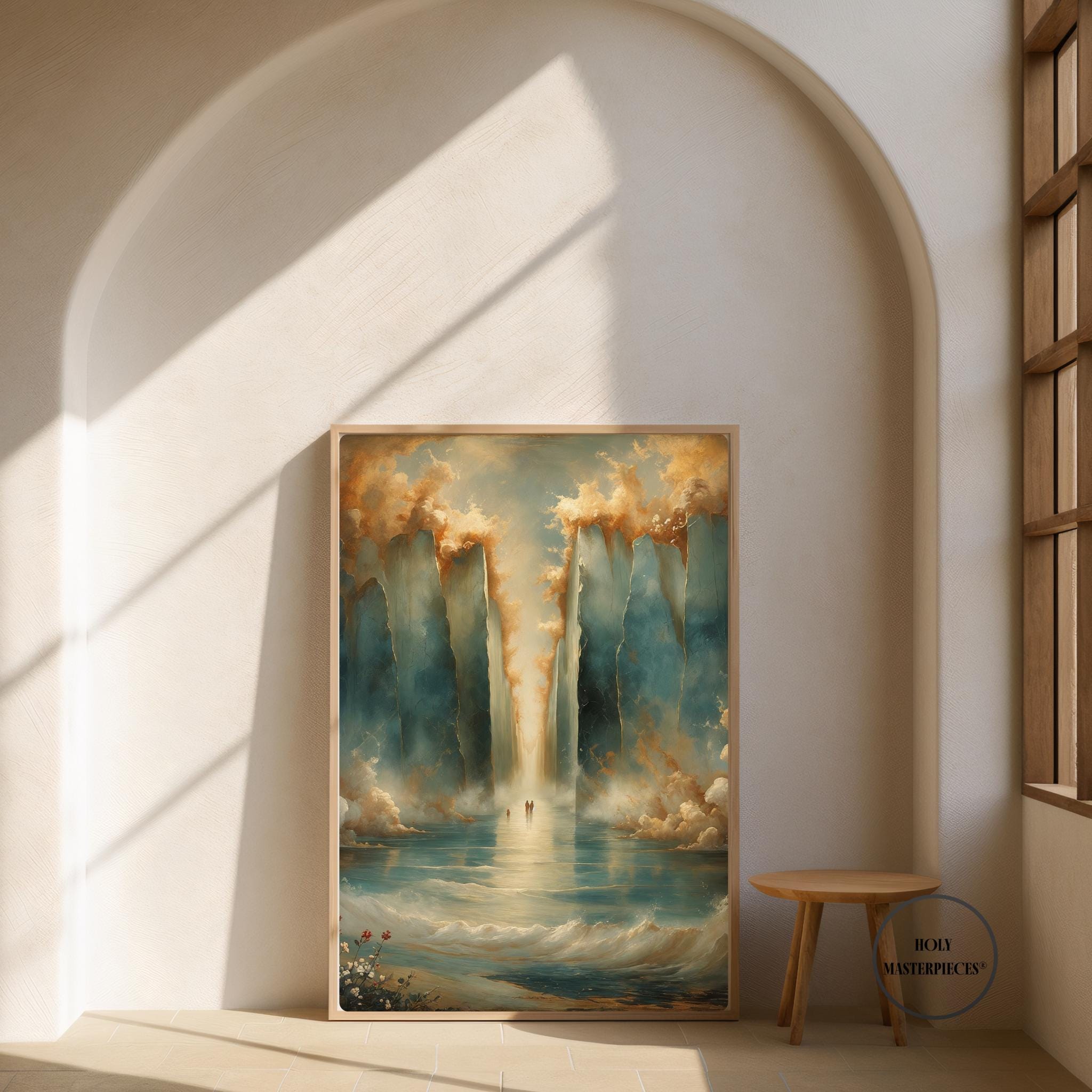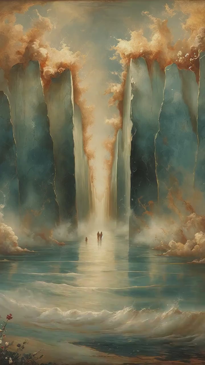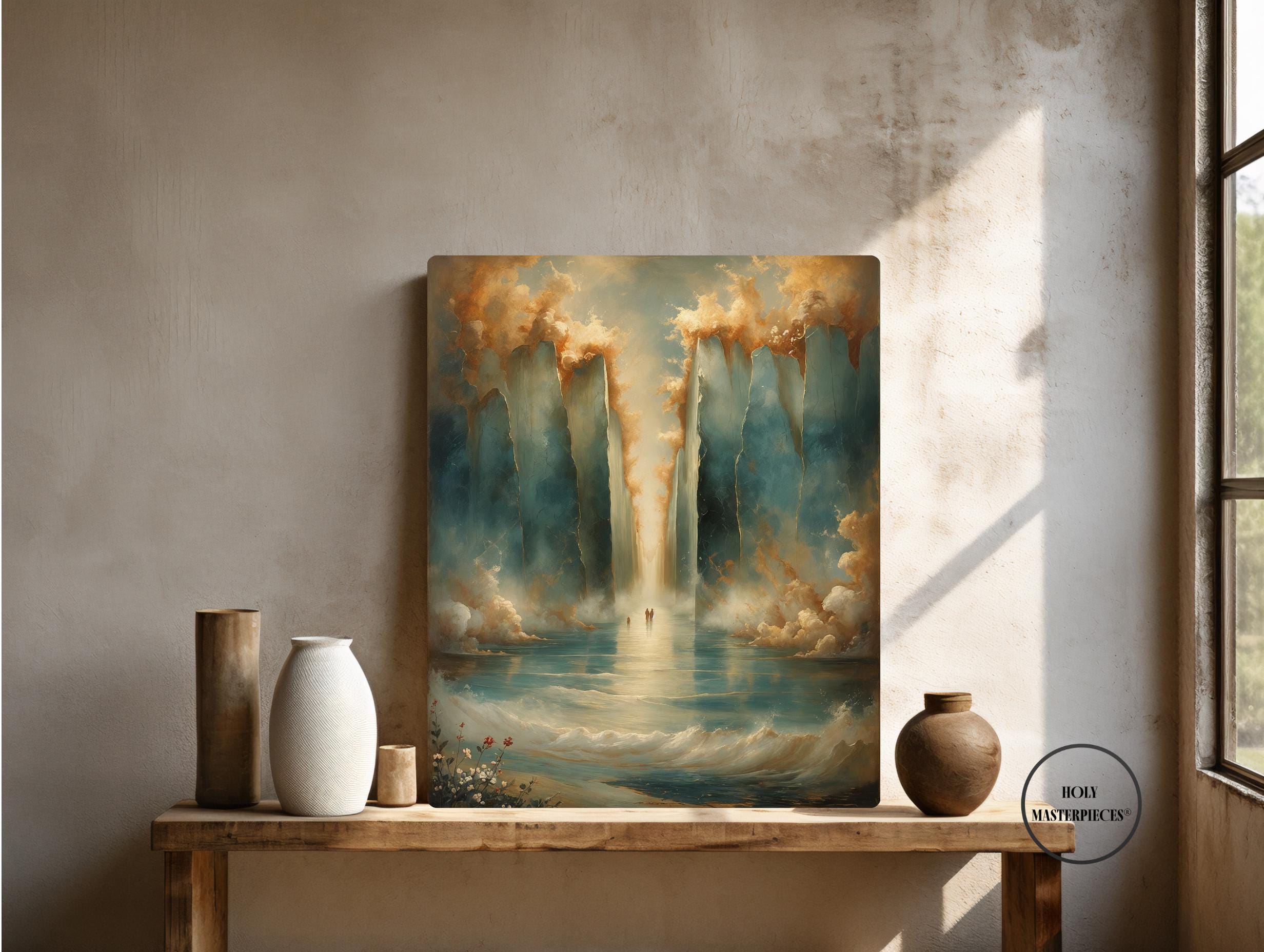 Parting of the Red Sea portrays one of the most powerful moments in the Old Testament, symbolizing divine deliverance, faith, and God’s sovereign power. The composition remains intentionally restrained and reverent, emphasizing atmosphere and scale rather than literal detail. Towering walls of water rise on either side, softly textured and illuminated, forming a sacred passage through the sea. This Old Testament Catholic wall art piece focuses on awe and trust rather than dramatic spectacle.