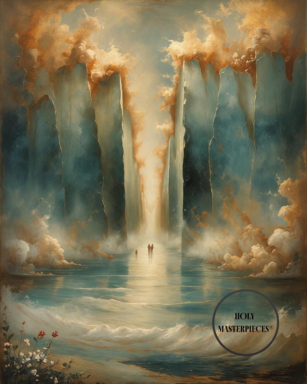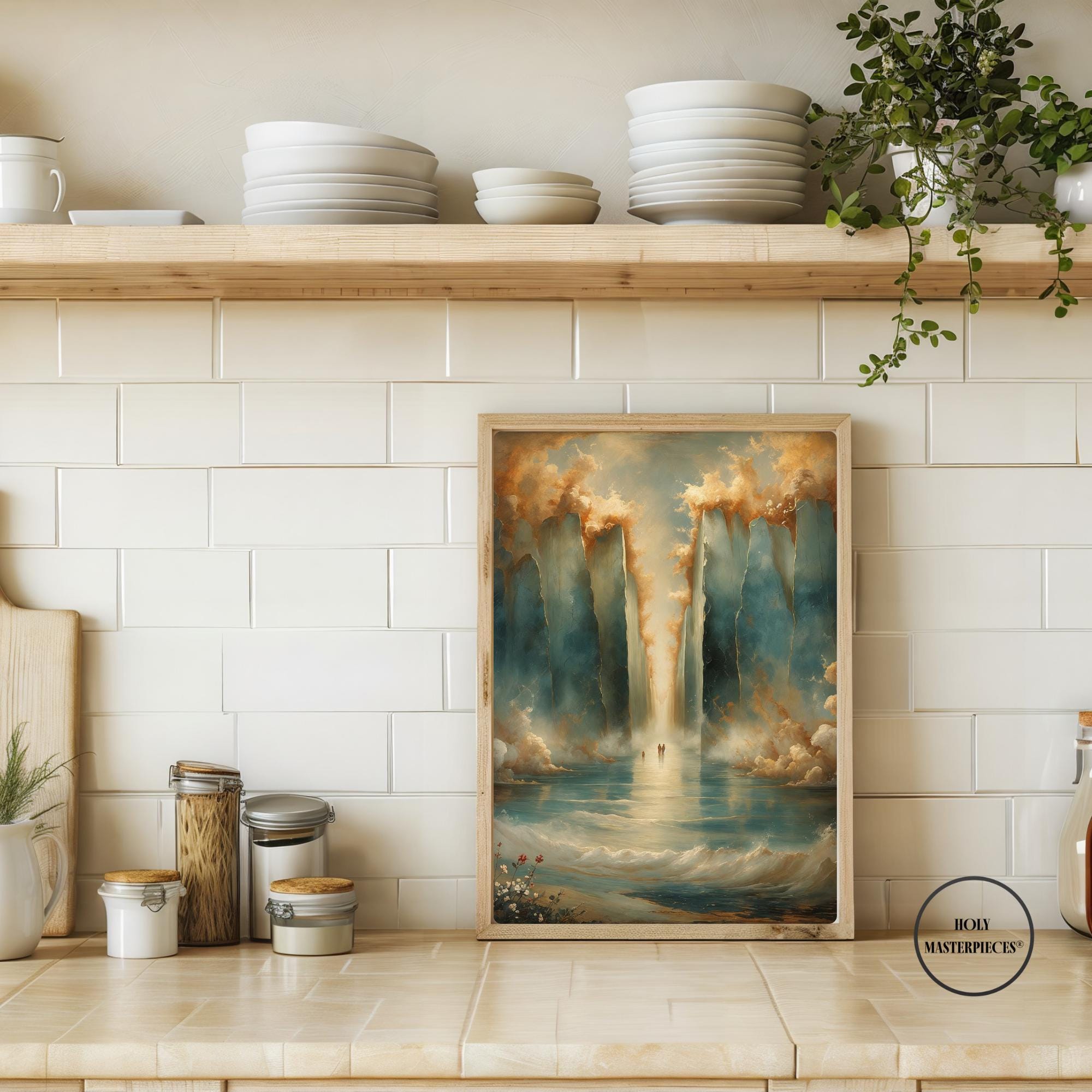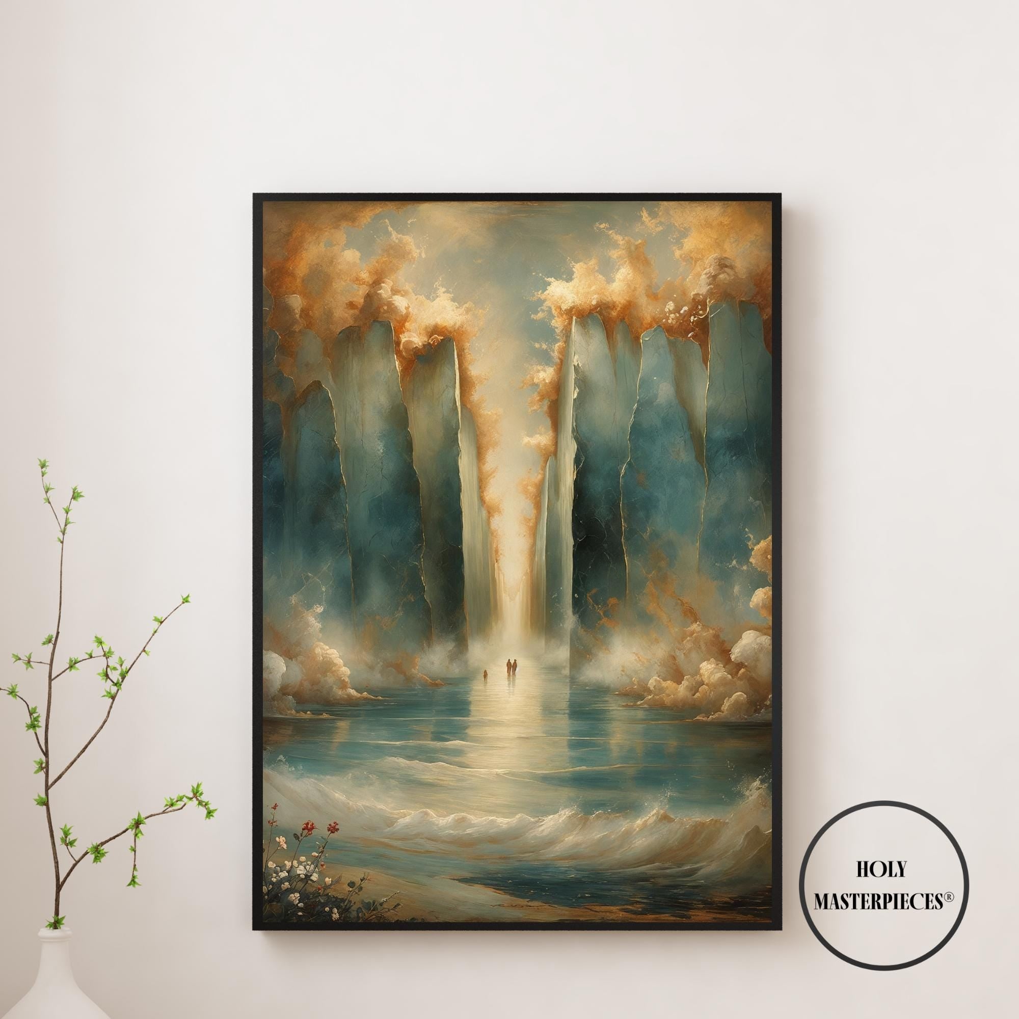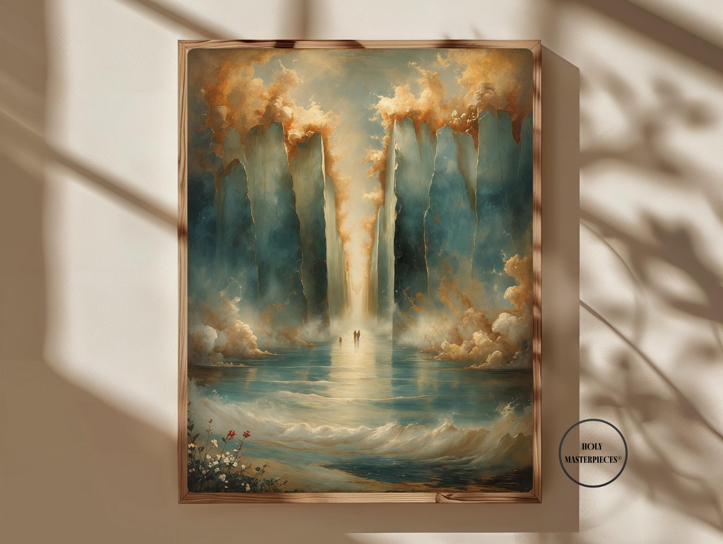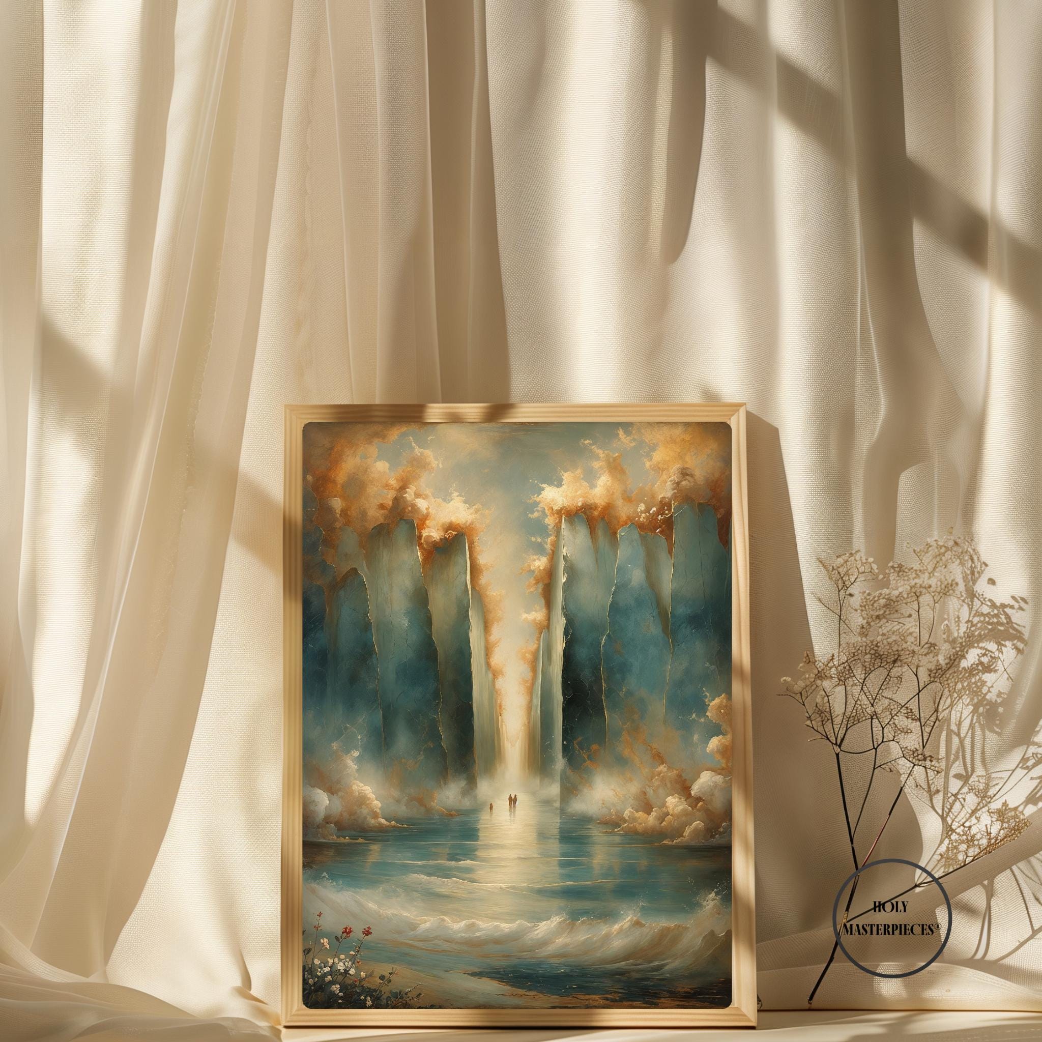 Parting of the Red Sea portrays one of the most powerful moments in the Old Testament, symbolizing divine deliverance, faith, and God’s sovereign power. The composition remains intentionally restrained and reverent, emphasizing atmosphere and scale rather than literal detail. Towering walls of water rise on either side, softly textured and illuminated, forming a sacred passage through the sea. This Old Testament Catholic wall art piece focuses on awe and trust rather than dramatic spectacle.