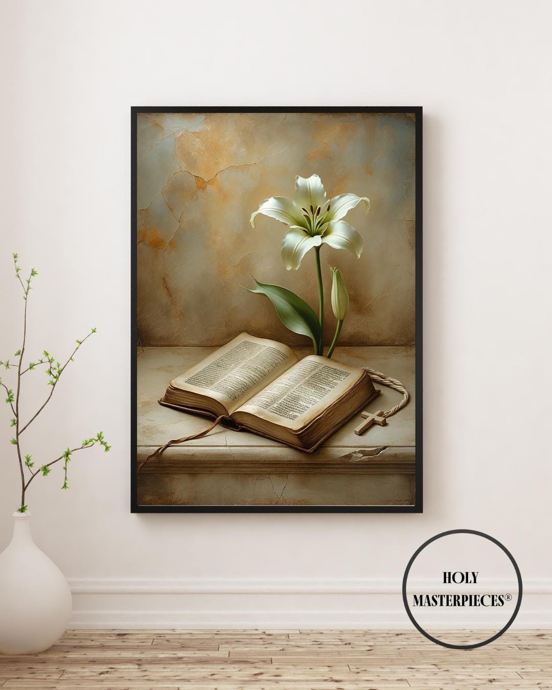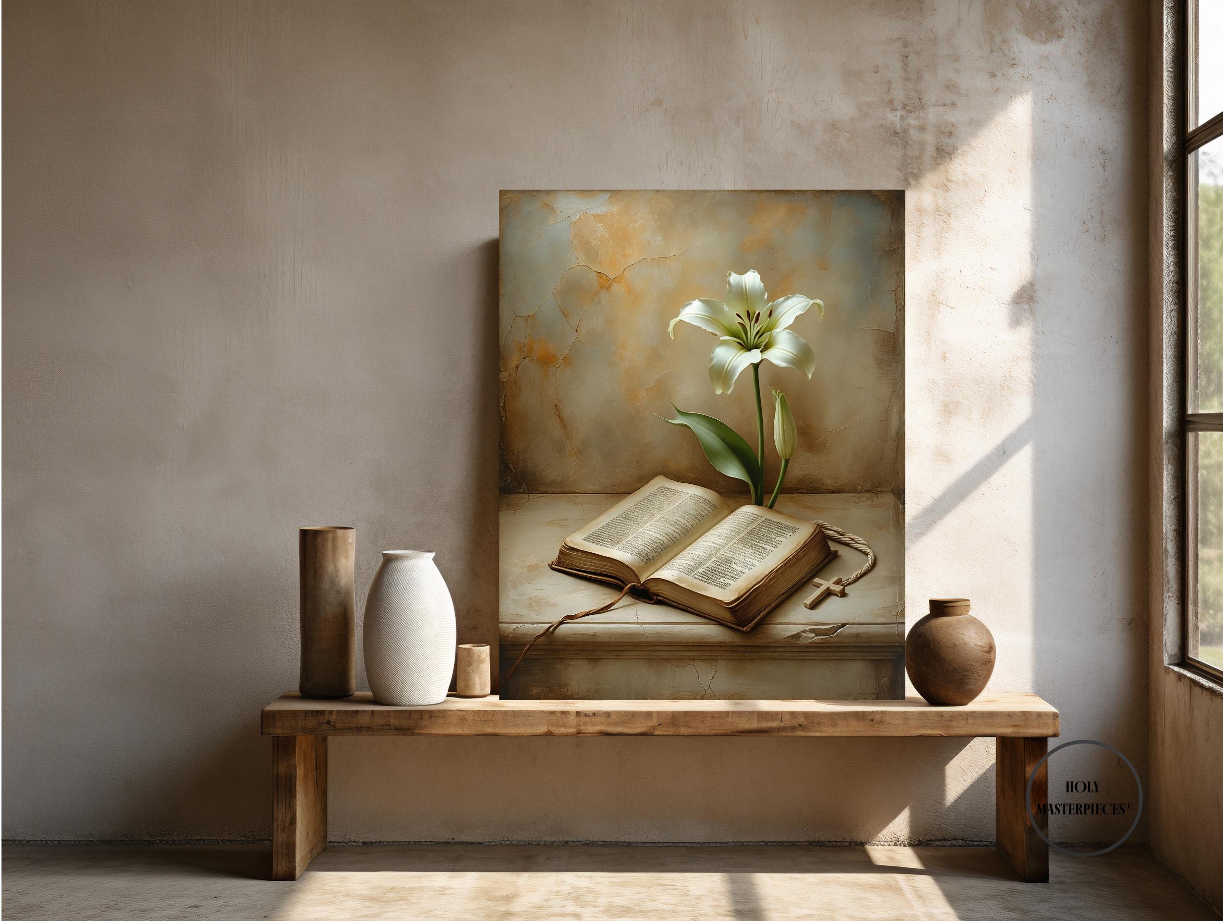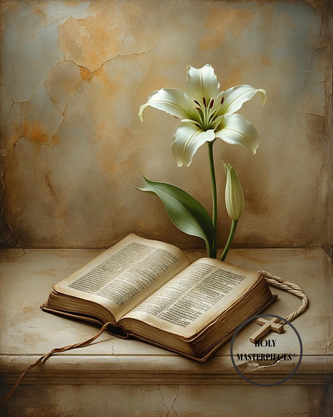 A serene sacred still-life featuring the traditional symbols of Saint Anthony of Padua arranged on an aged devotional altar. A gently worn antique book symbolizes preaching and wisdom, while a white lily represents purity and holiness. A small wooden Tau cross or rosary may rest nearby, contributing to the quiet devotional atmosphere. Warm chiaroscuro lighting highlights each object with reverence and calm, inviting reflection on Saint Anthony’s humility, compassion, and dedication to the Gospel.