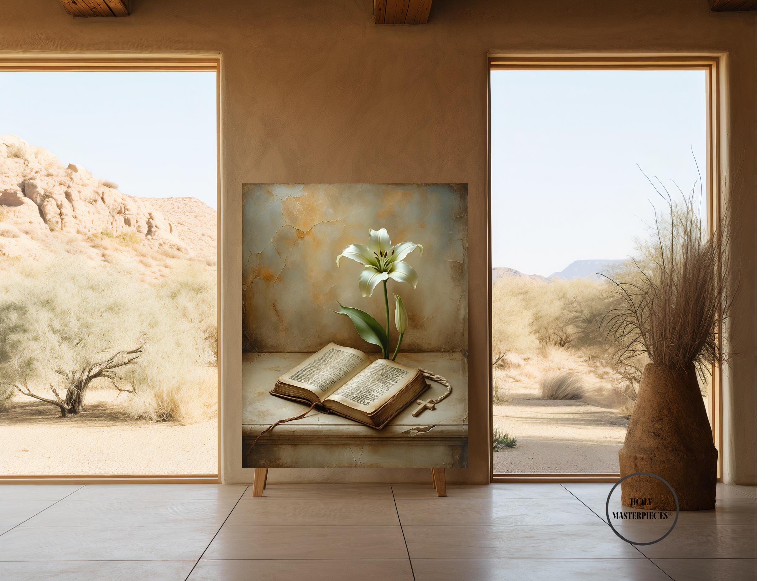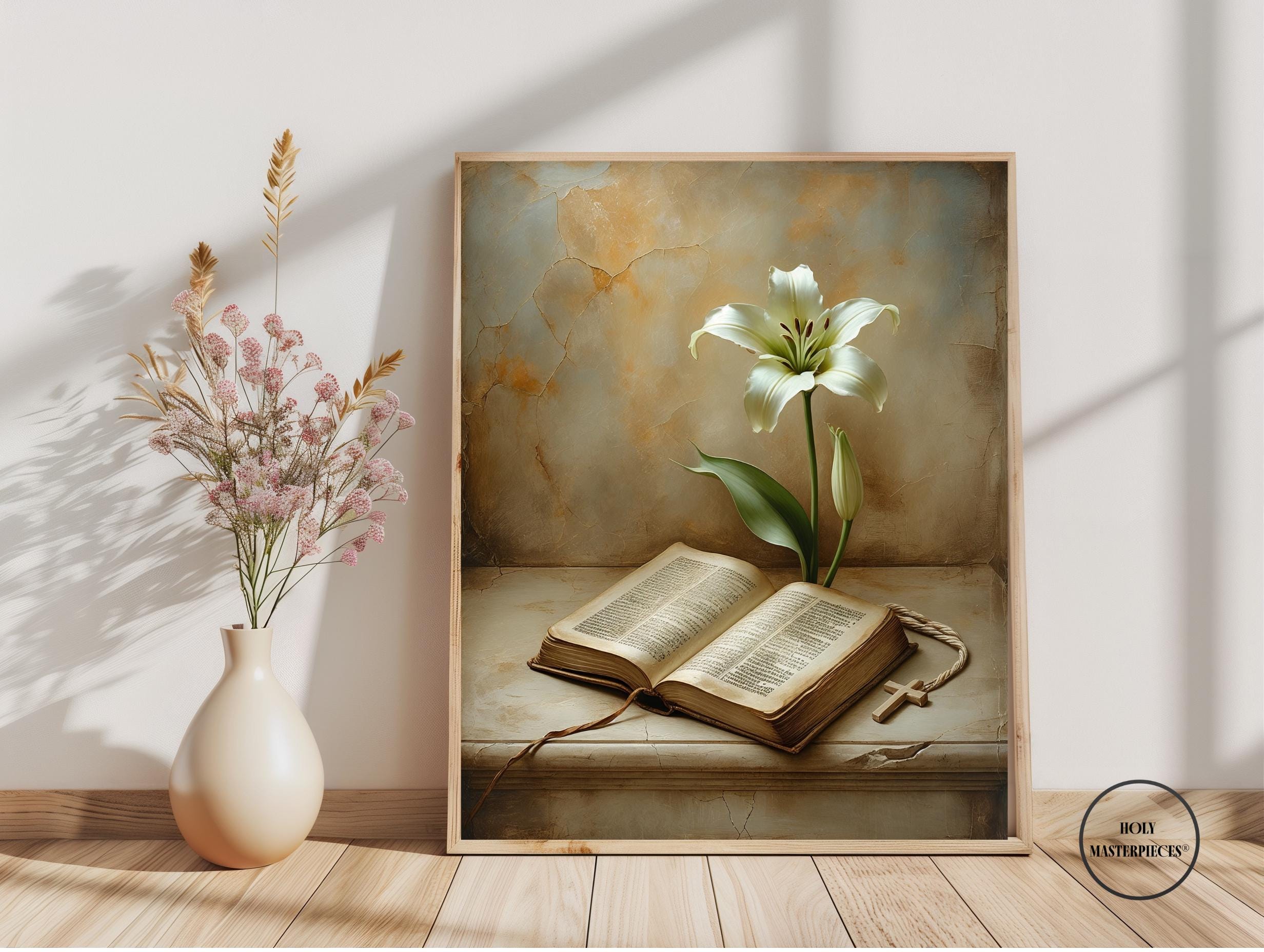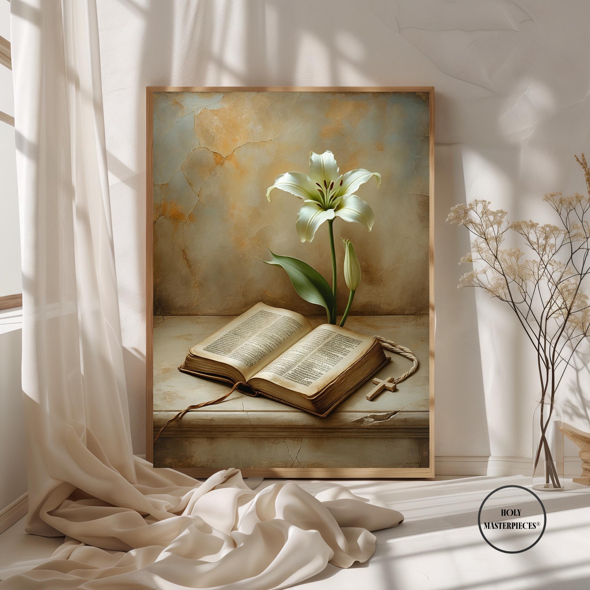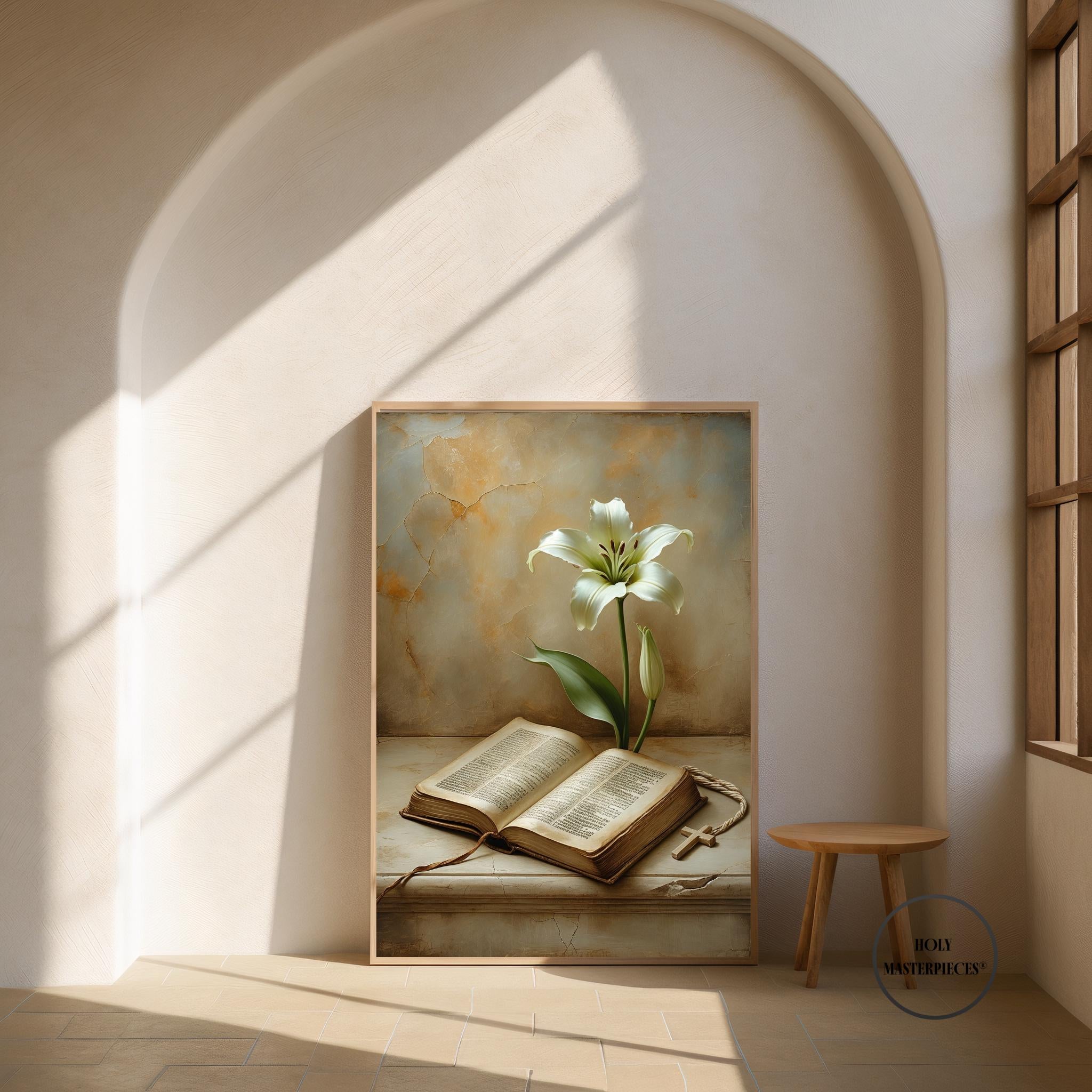 A serene sacred still-life featuring the traditional symbols of Saint Anthony of Padua arranged on an aged devotional altar. A gently worn antique book symbolizes preaching and wisdom, while a white lily represents purity and holiness. A small wooden Tau cross or rosary may rest nearby, contributing to the quiet devotional atmosphere. Warm chiaroscuro lighting highlights each object with reverence and calm, inviting reflection on Saint Anthony’s humility, compassion, and dedication to the Gospel.