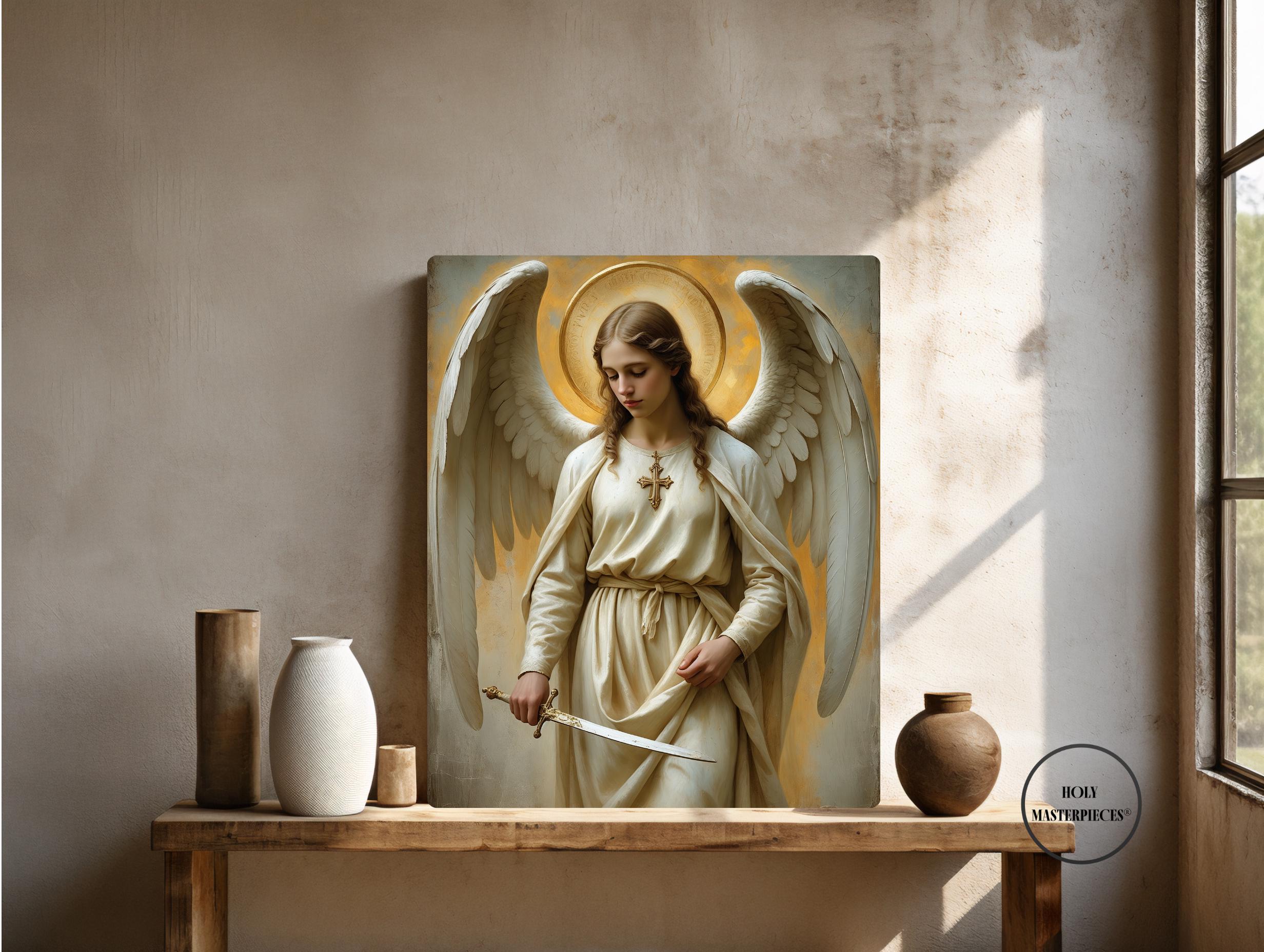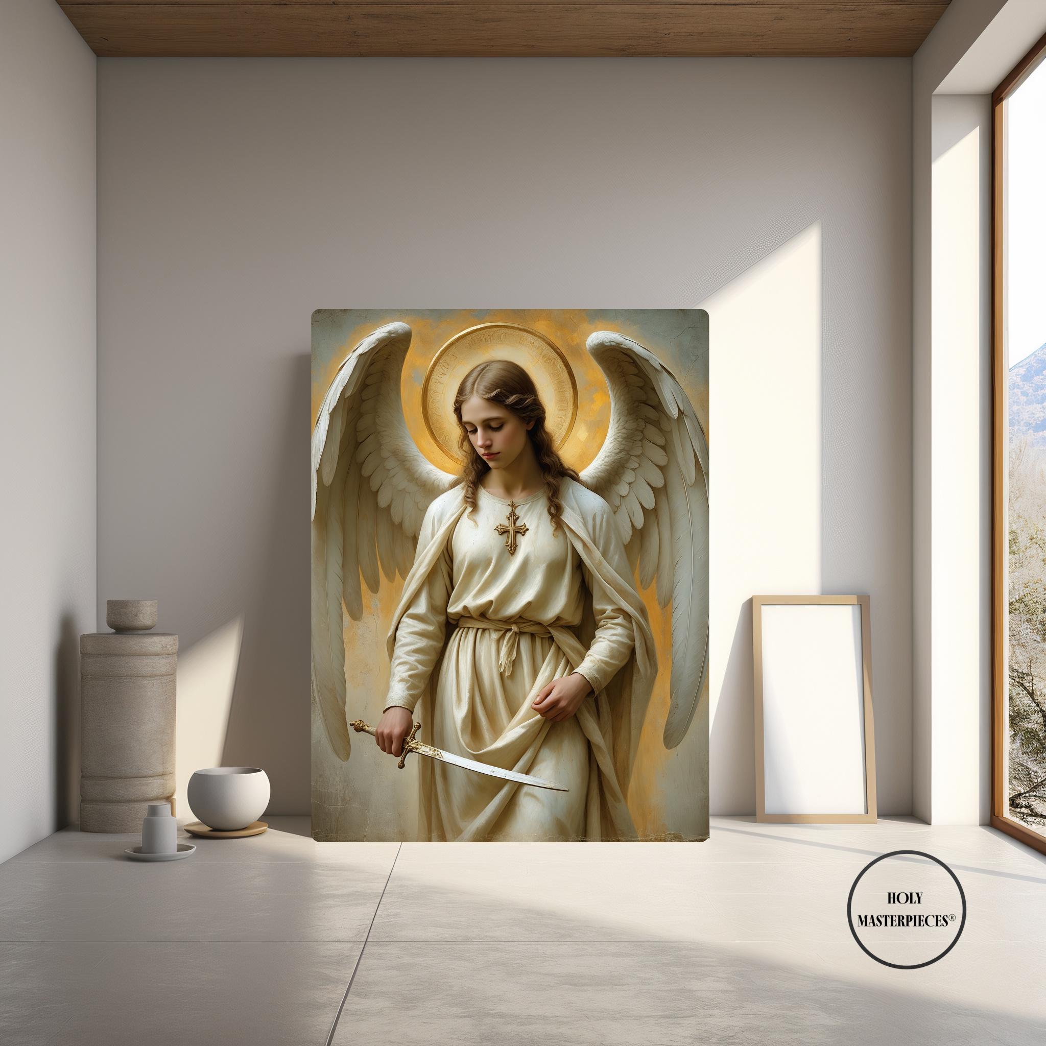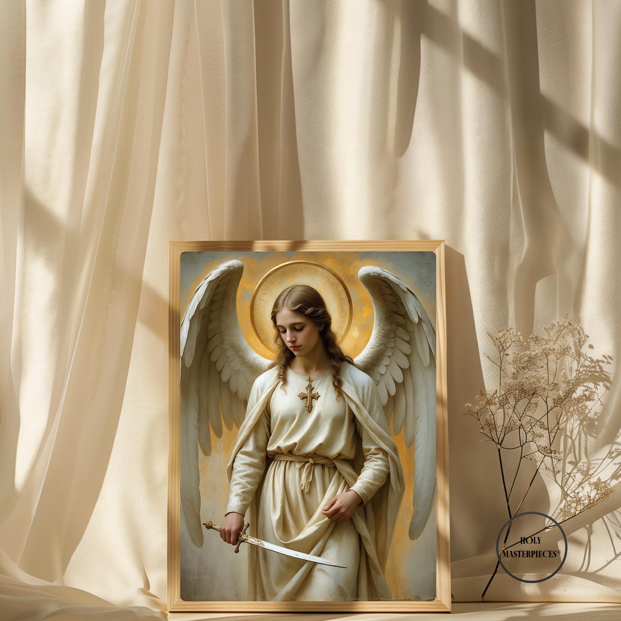 A serene and powerful portrait of Saint Michael the Archangel, defender of Heaven and protector of the faithful, created in a classical 17th-century painterly style. Depicted with calm authority, natural wings, and a radiant golden halo, Saint Michael holds a lowered sword symbolising righteous judgement and divine protection. Soft warm tones, delicate brushwork, and sacred symbolism give this artwork a timeless devotional presence. Part of the Archangels Wall Art series by Holy Masterpieces®.