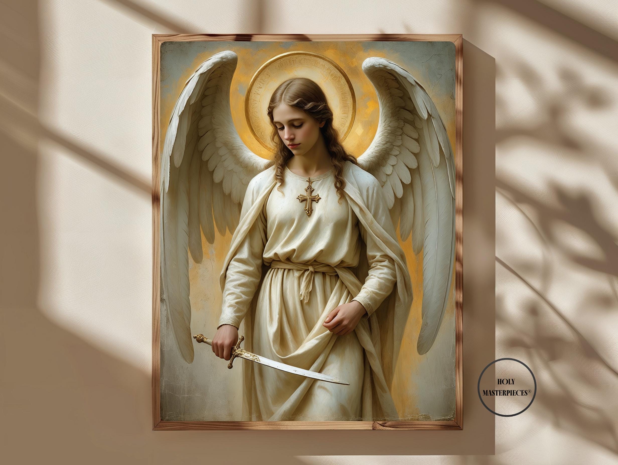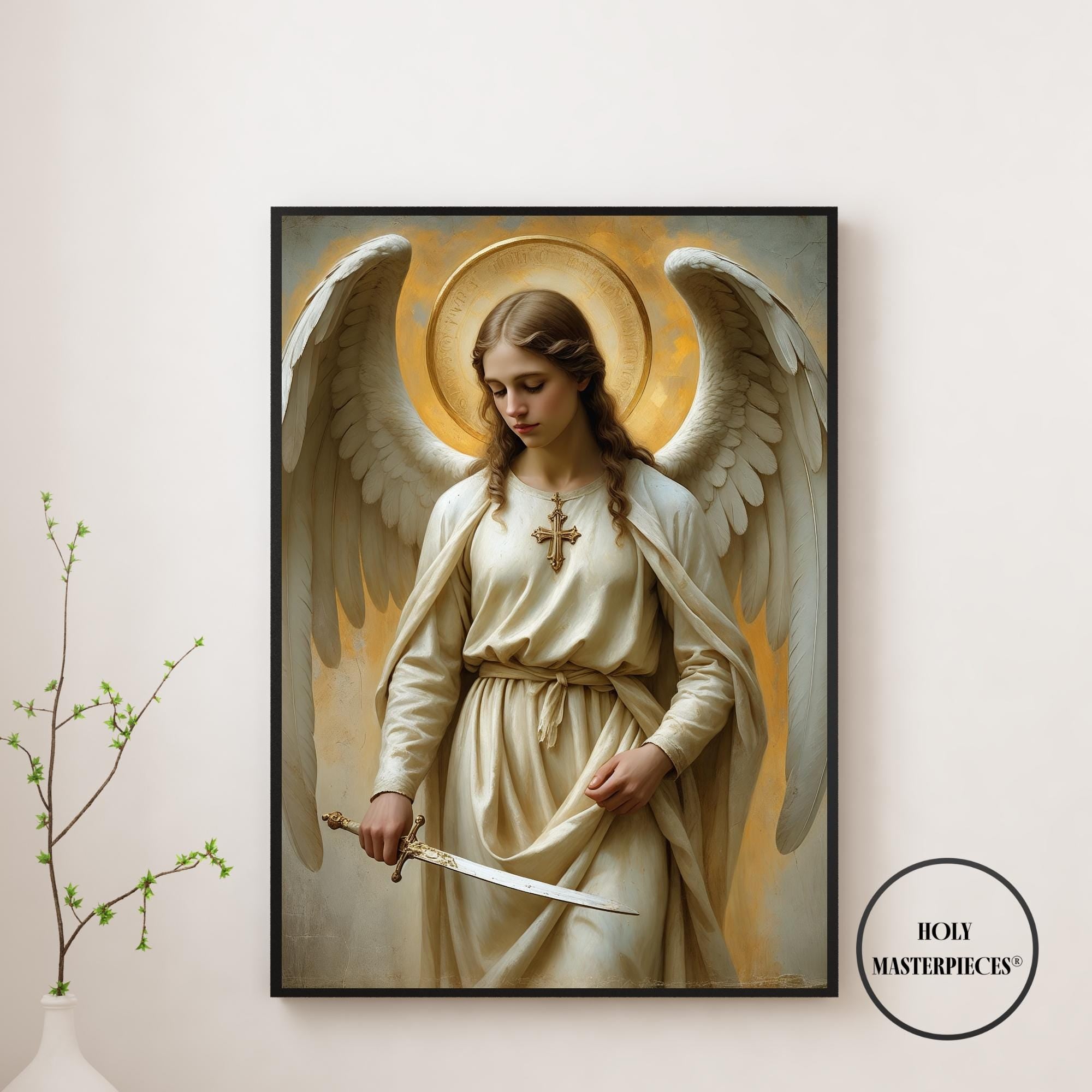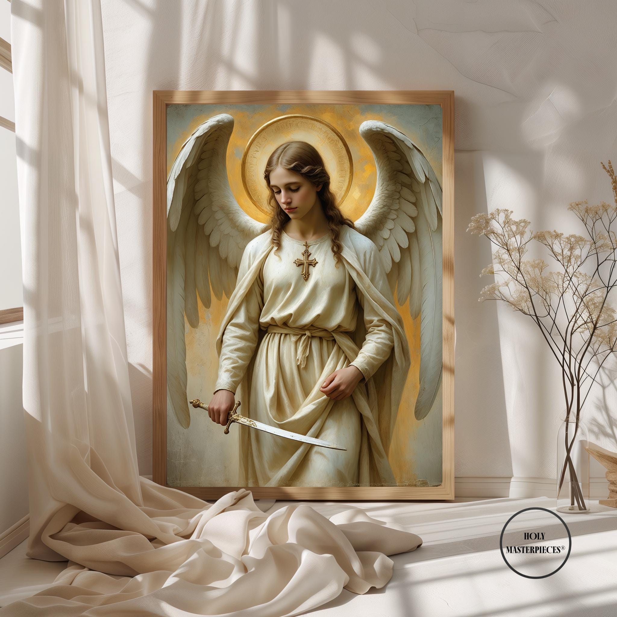 A serene and powerful portrait of Saint Michael the Archangel, defender of Heaven and protector of the faithful, created in a classical 17th-century painterly style. Depicted with calm authority, natural wings, and a radiant golden halo, Saint Michael holds a lowered sword symbolising righteous judgement and divine protection. Soft warm tones, delicate brushwork, and sacred symbolism give this artwork a timeless devotional presence. Part of the Archangels Wall Art series by Holy Masterpieces®.