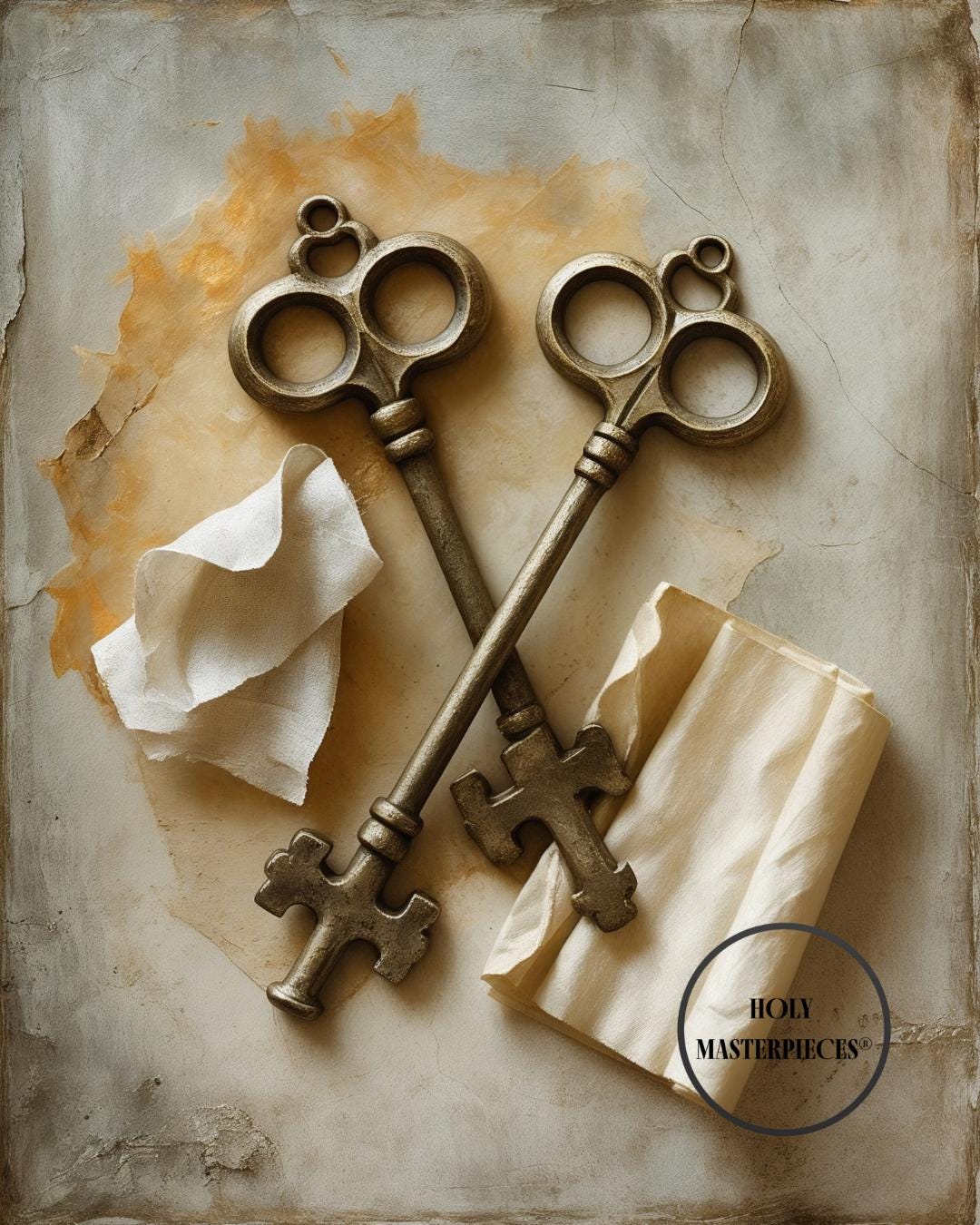A reverent and timeless still-life featuring the traditional symbols of Saint Peter, arranged upon an aged devotional altar. Two antique keys—one larger, one smaller—lie crossed in the classic papal formation, representing the authority entrusted to Saint Peter and the foundation of the Church. Their warm bronze and iron patina gives them an aged, sacred presence. A small cream cloth and a simple parchment piece add gentle symbolic references to Peter’s humility, leadership, and role as teacher.