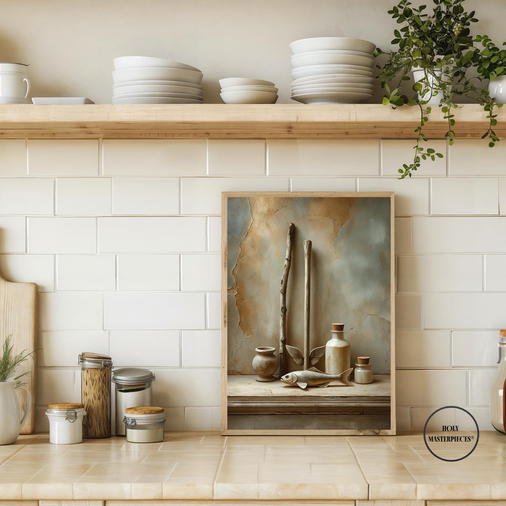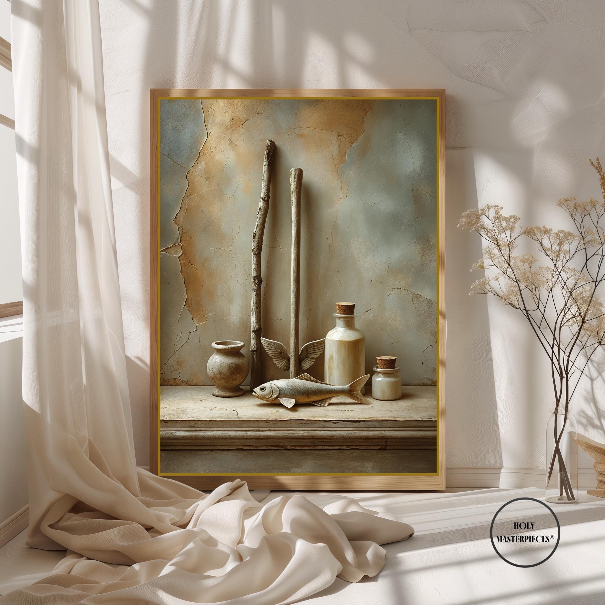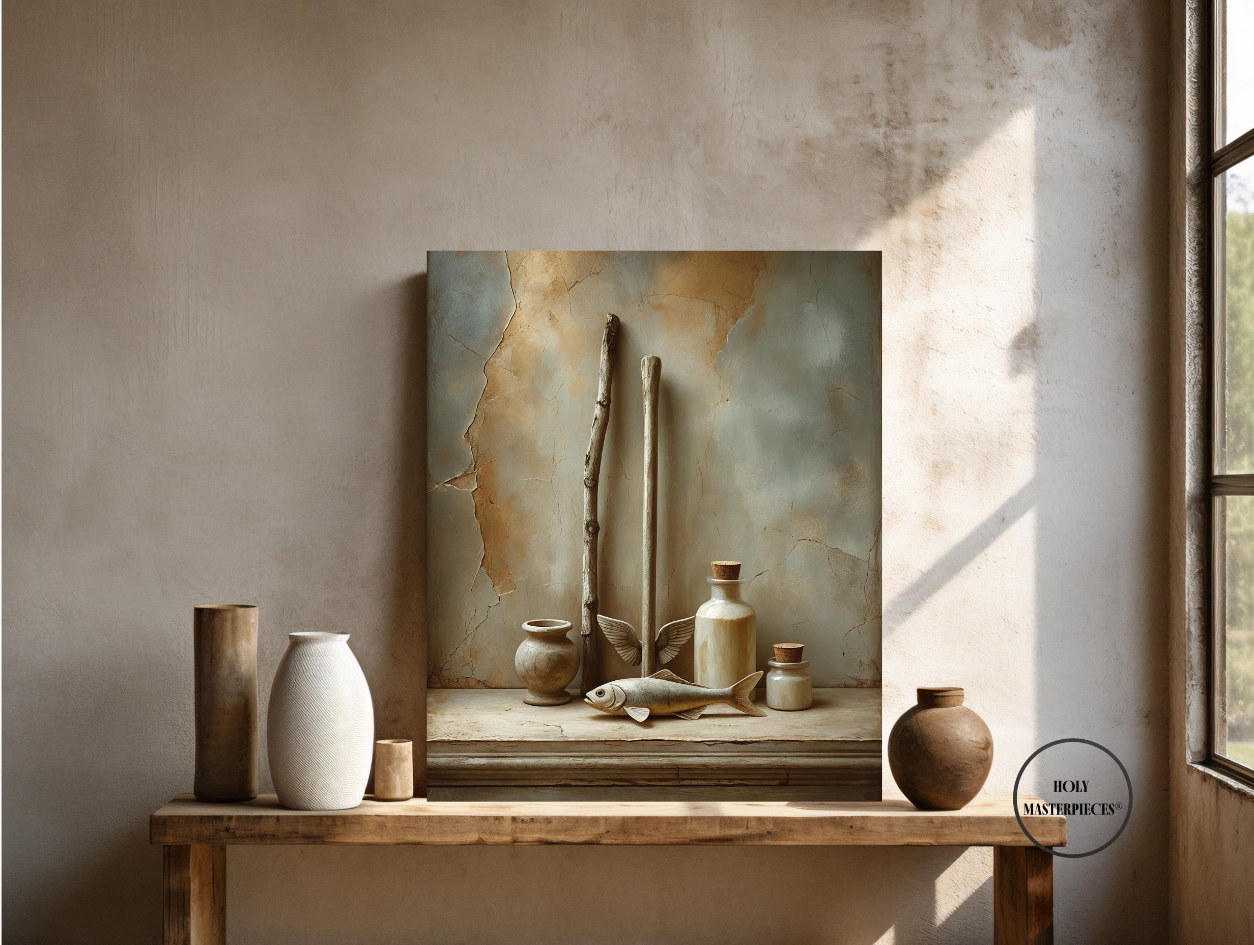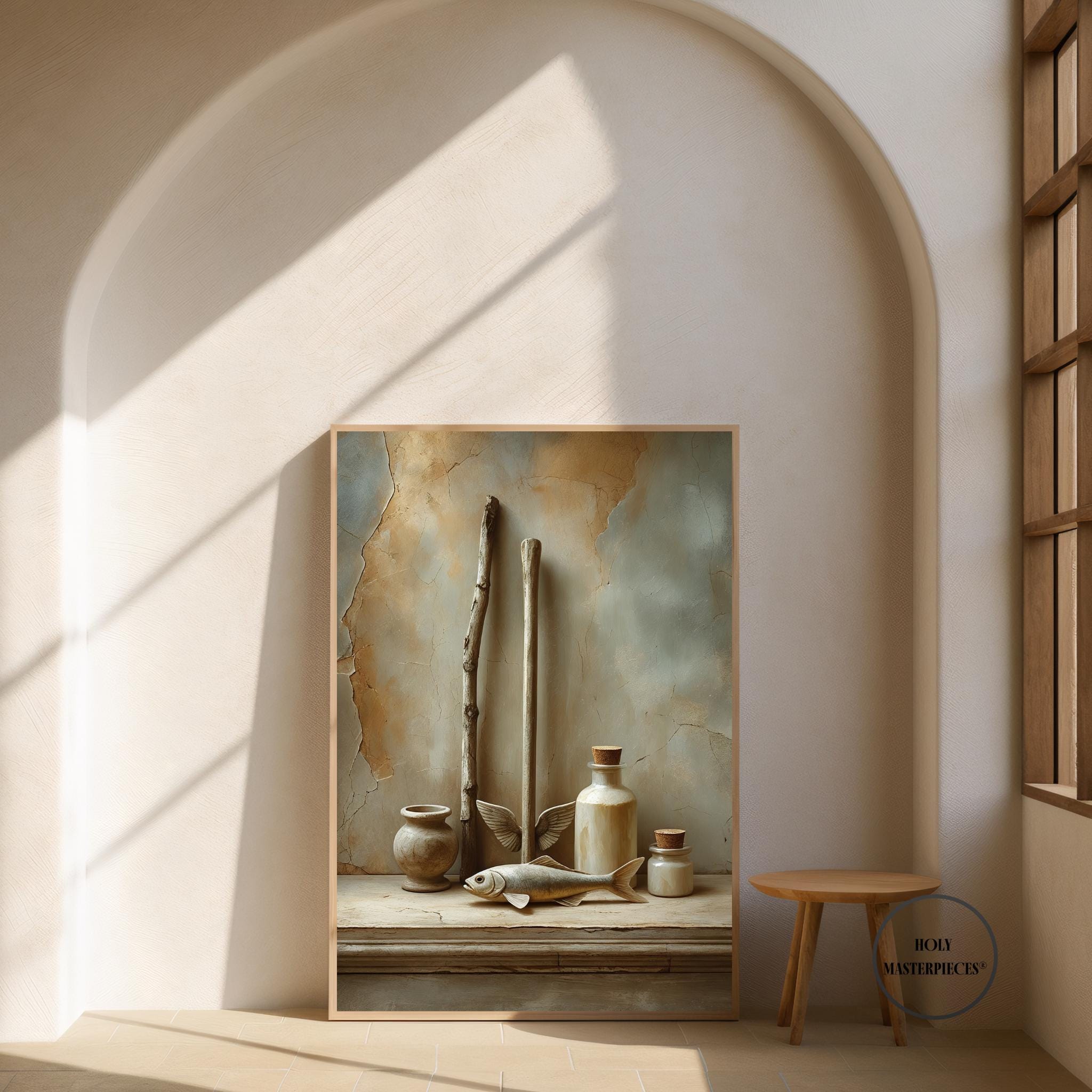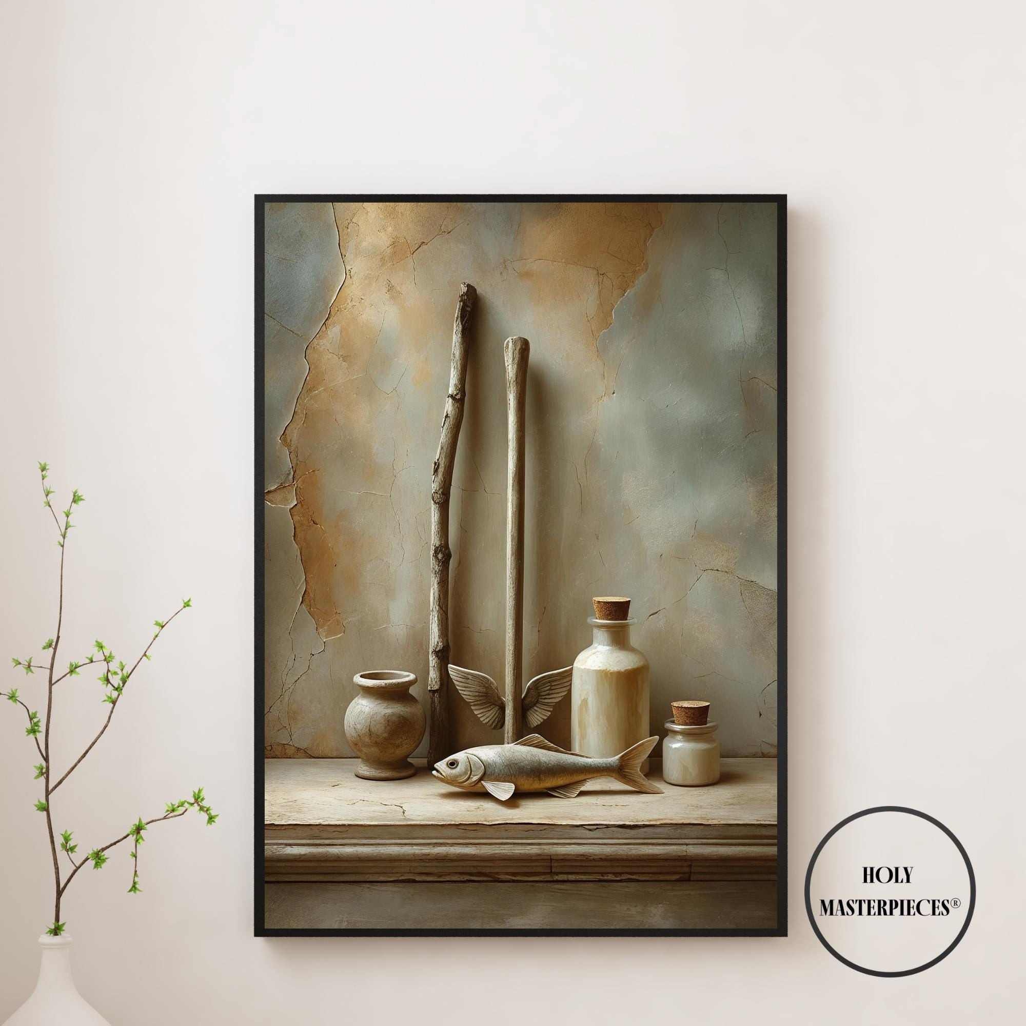 A gentle and symbolic sacred still-life honoring Saint Raphael, the healing archangel and companion of Tobit. A rustic wooden staff and natural pilgrim’s branch rest at the center, recalling Raphael’s journey with Tobiah. At the front lies a soft-toned symbolic fish, representing the healing miracle given by God. Several ancient jars with cork stoppers stand nearby, referencing the balm and remedies tied to Raphael’s mission of restoration. A small carved wing ornament adds a subtle heavenly touch without depicting a figure.