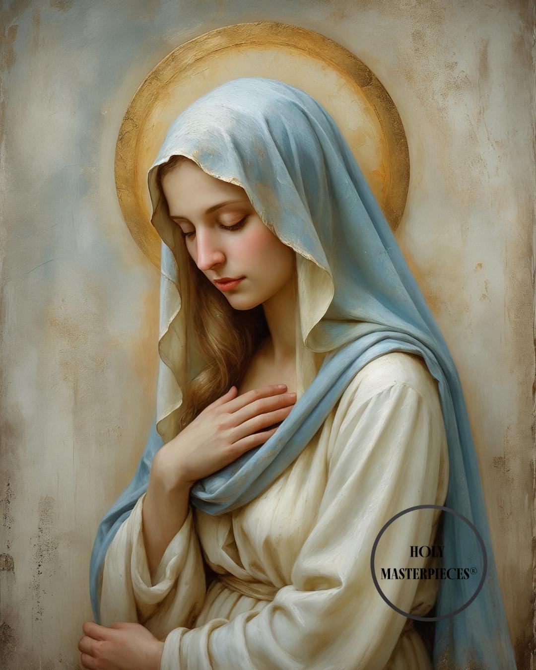 • Blue Veil Madonna — A serene portrait of the Virgin wearing a soft blue mantle and ivory veil, capturing quiet grace and devotional beauty