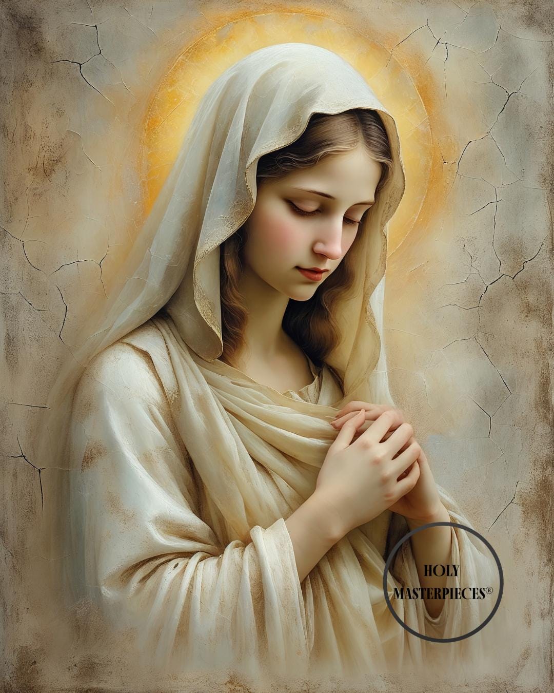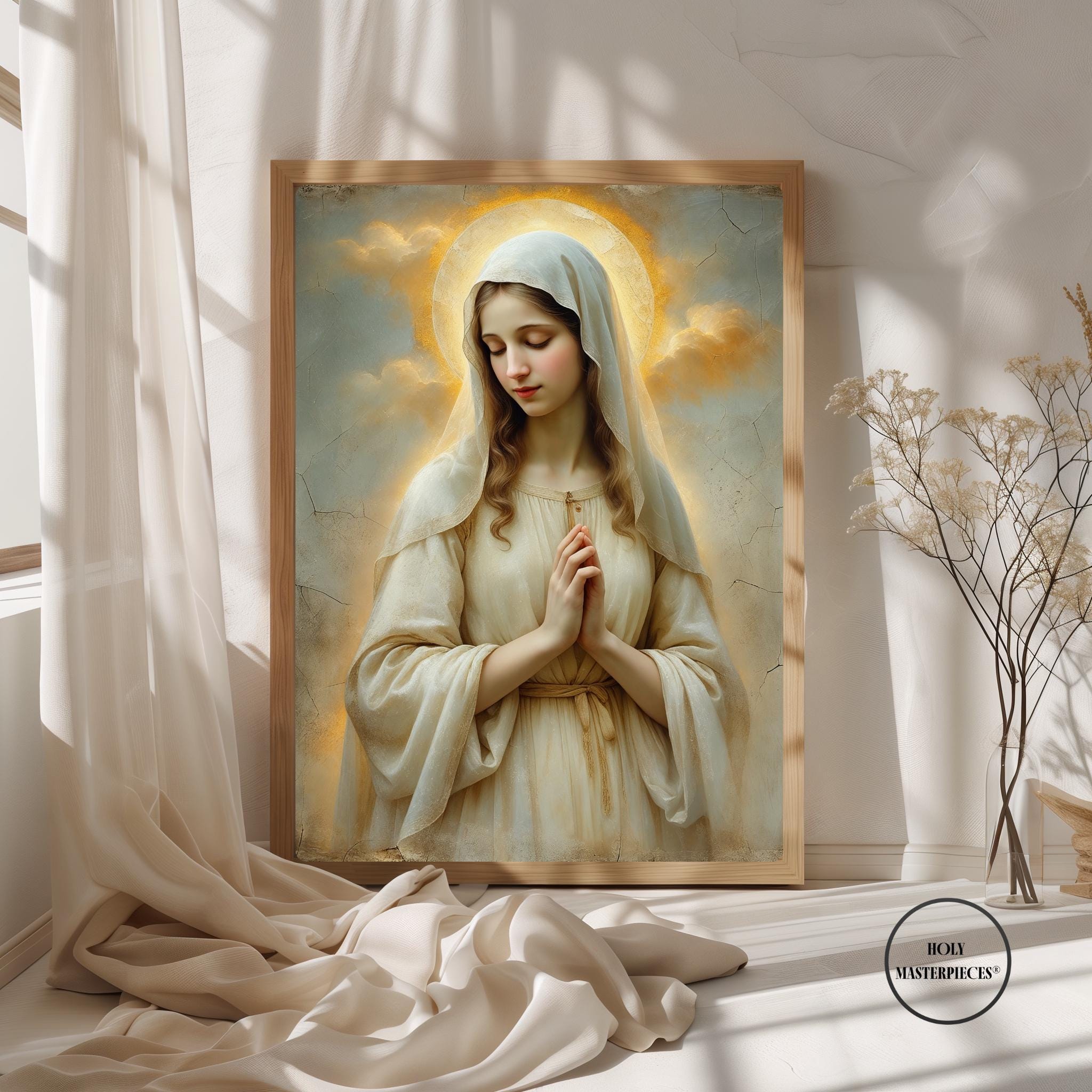 Created in the tradition of 17th-century Western sacred oil painting, the collection is rendered with soft painterly textures, muted devotional palettes, gentle chiaroscuro, and aged cracked-plaster backgrounds. The compositions are reverent and restrained, inviting silence, contemplation, and devotion within prayer rooms, chapels, and sacred interiors.