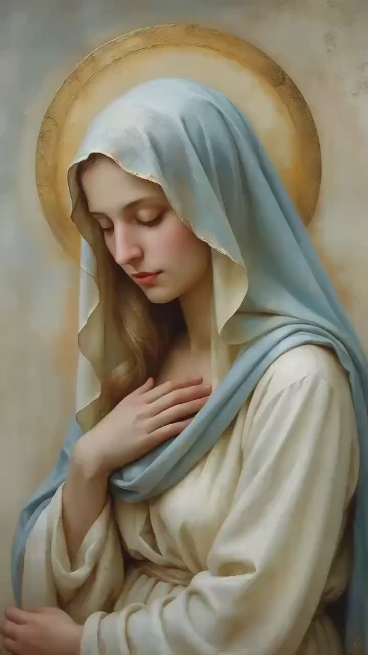 • Gentle Veil Madonna — Mary with head inclined beneath a flowing veil, embodying humility, obedience, and tender maternal trust