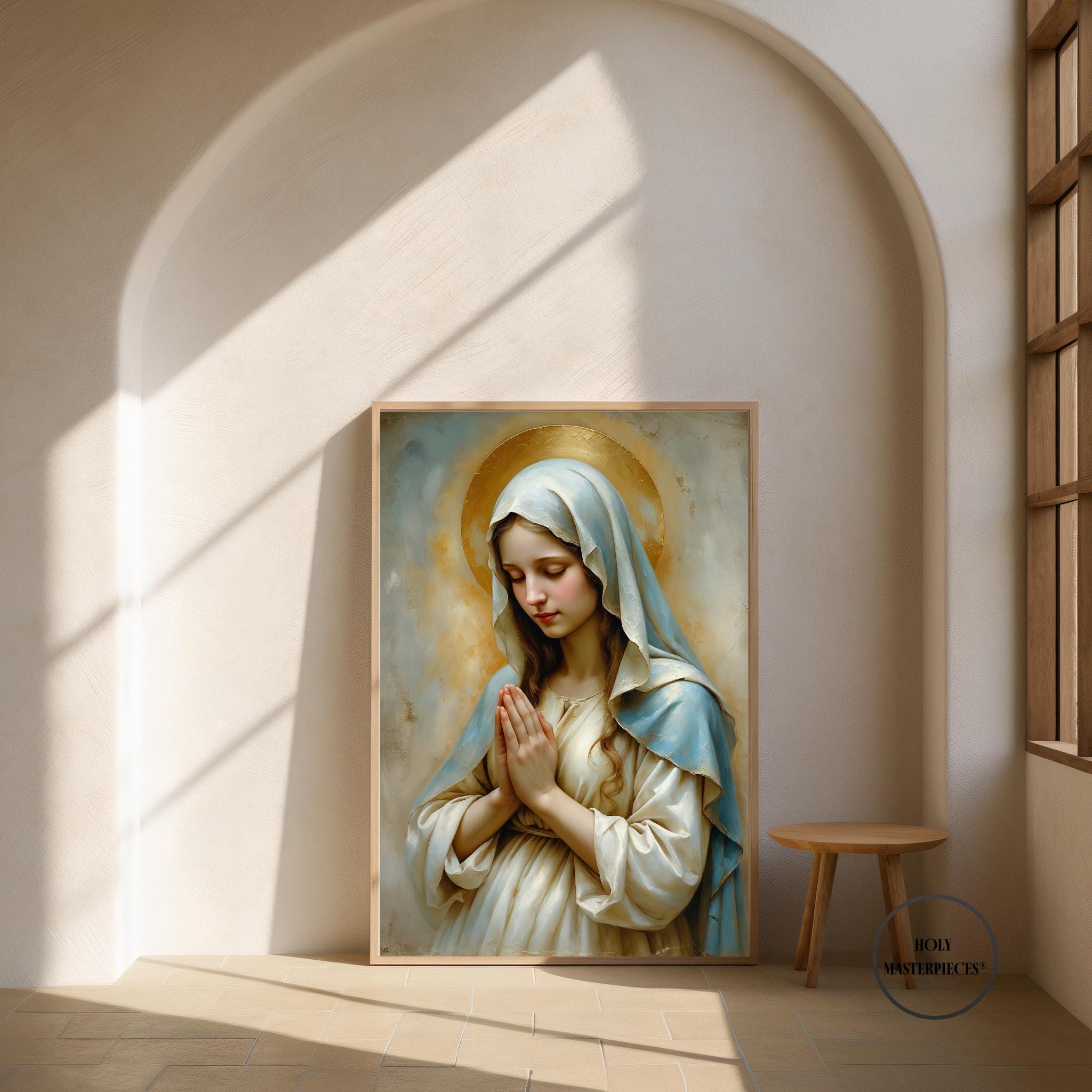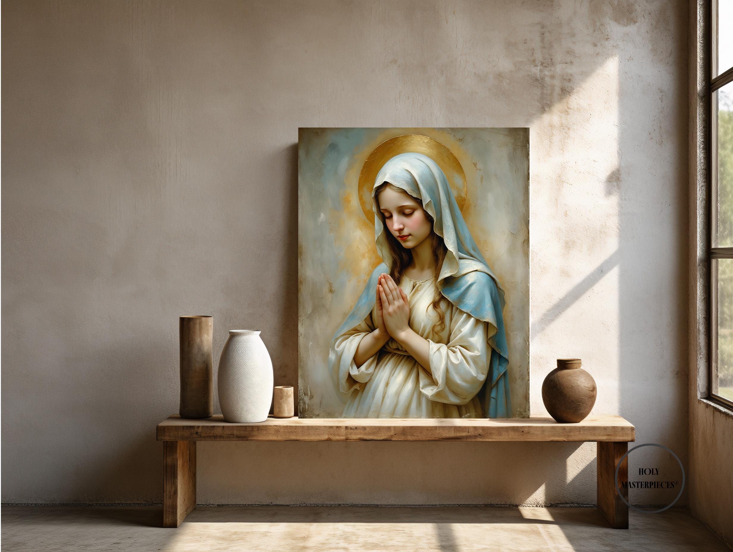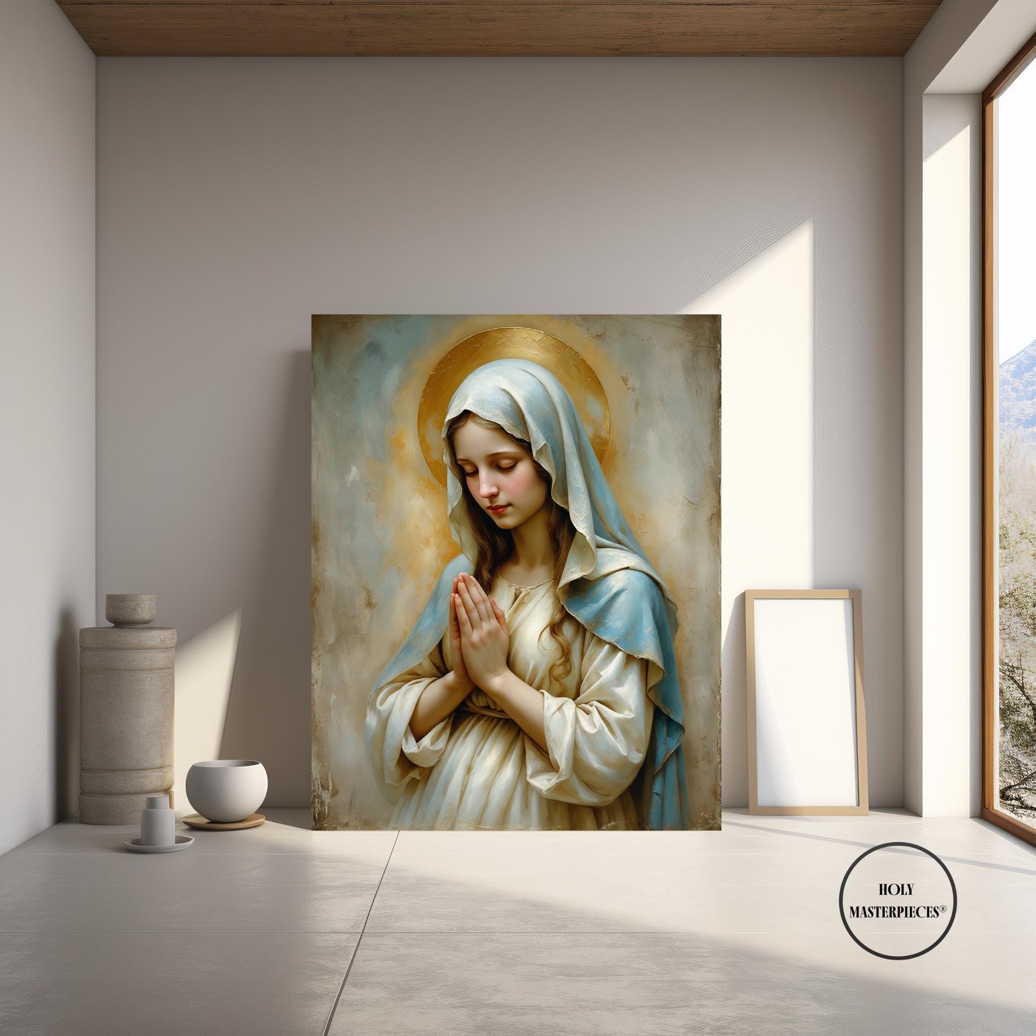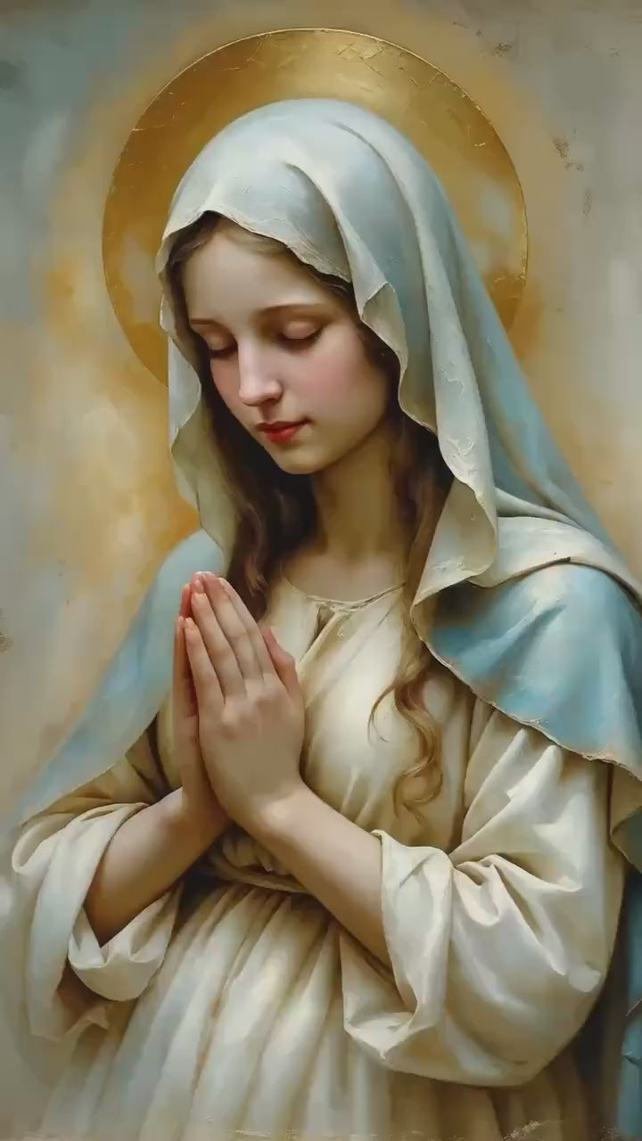 A peaceful Christian artwork for prayer spaces, Catholic homes, and Marian devotional decor. Part of the Holy Masterpieces® collection.