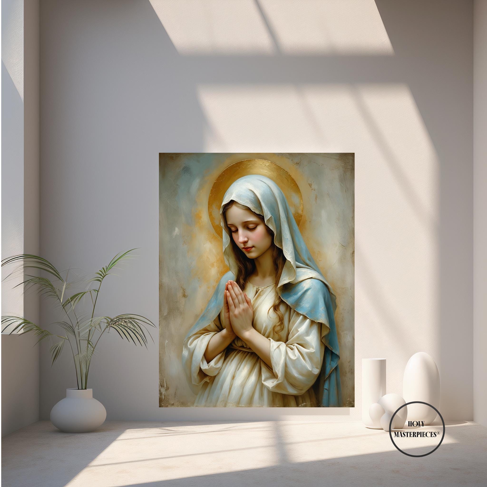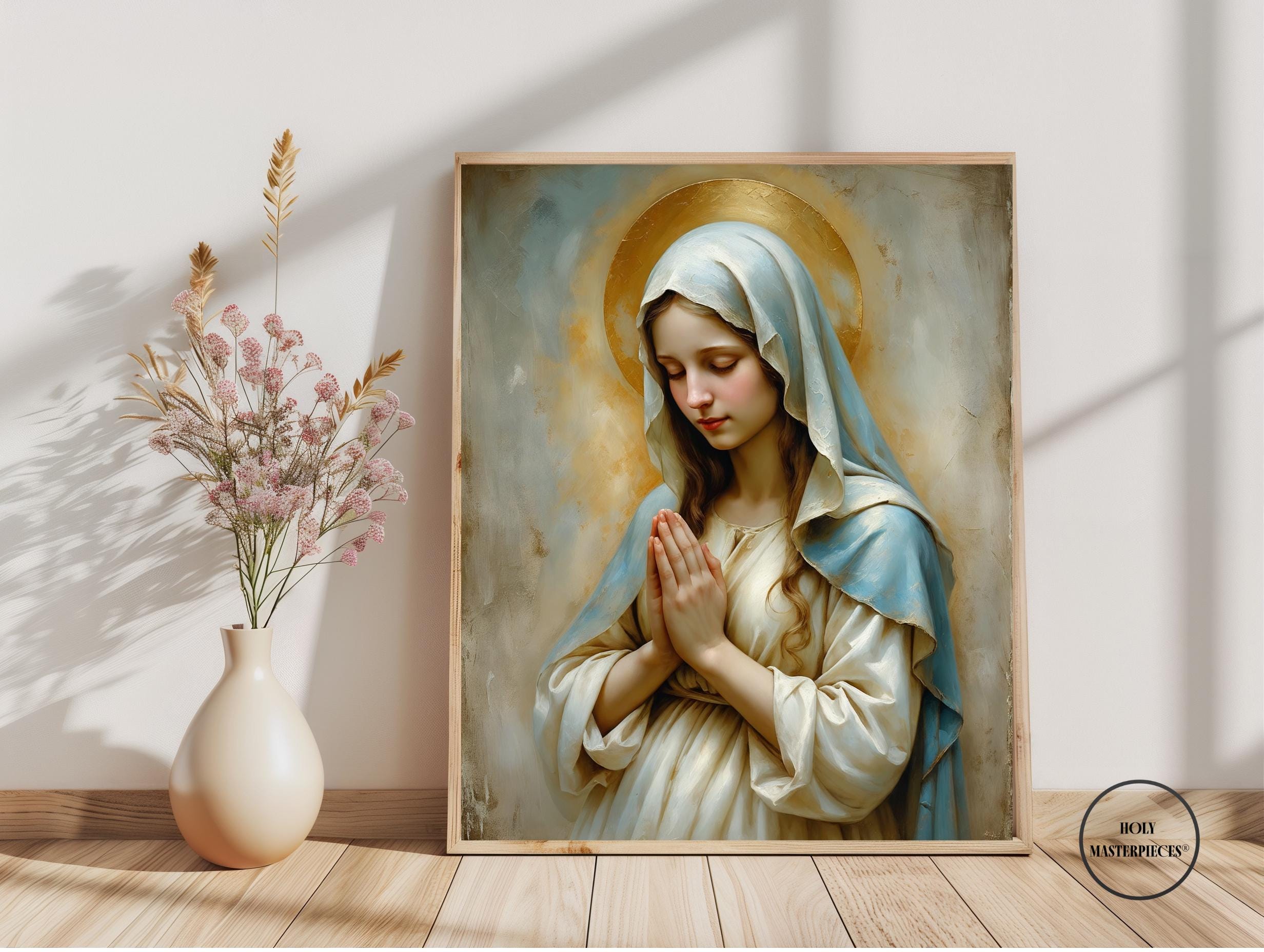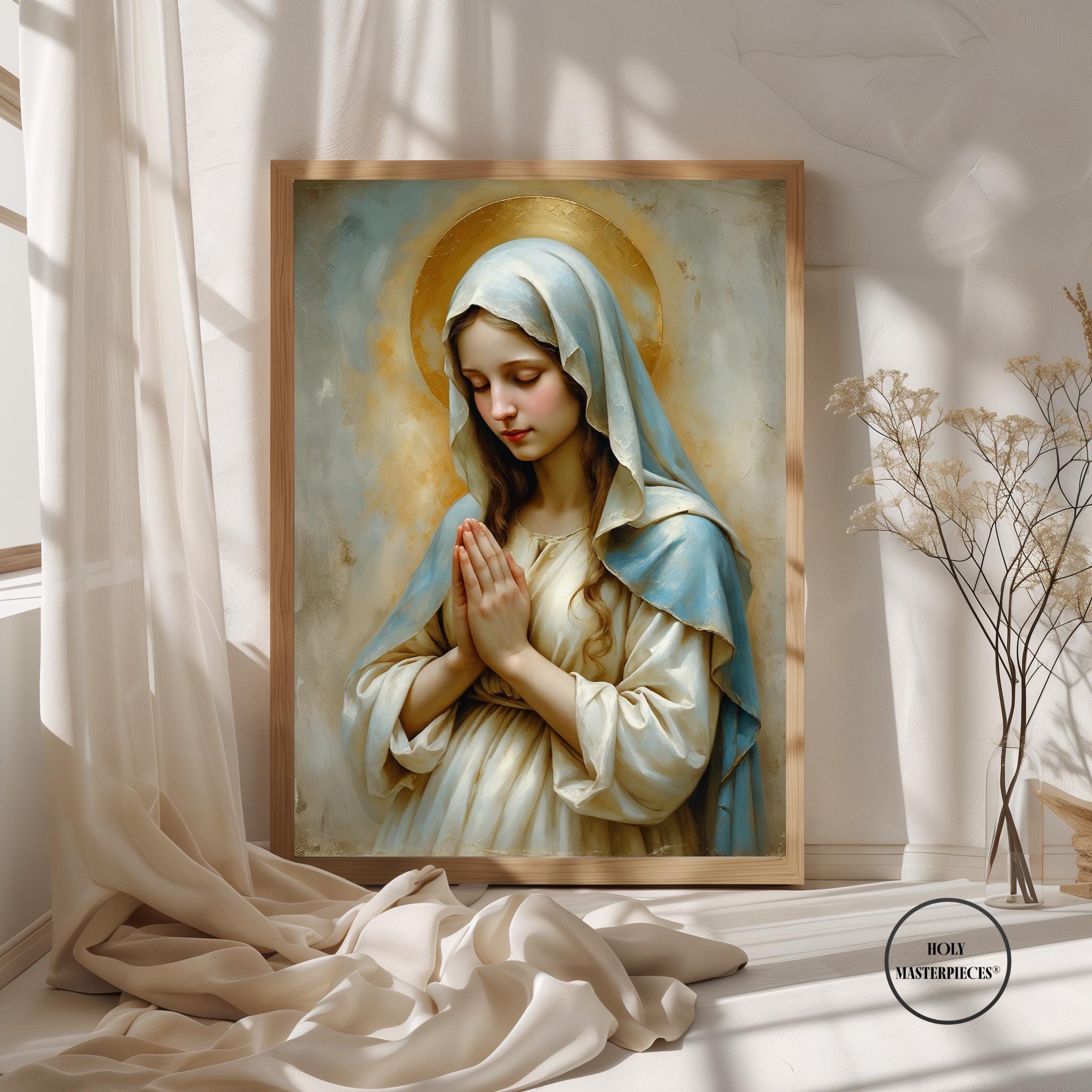A peaceful Christian artwork for prayer spaces, Catholic homes, and Marian devotional decor. Part of the Holy Masterpieces® collection.