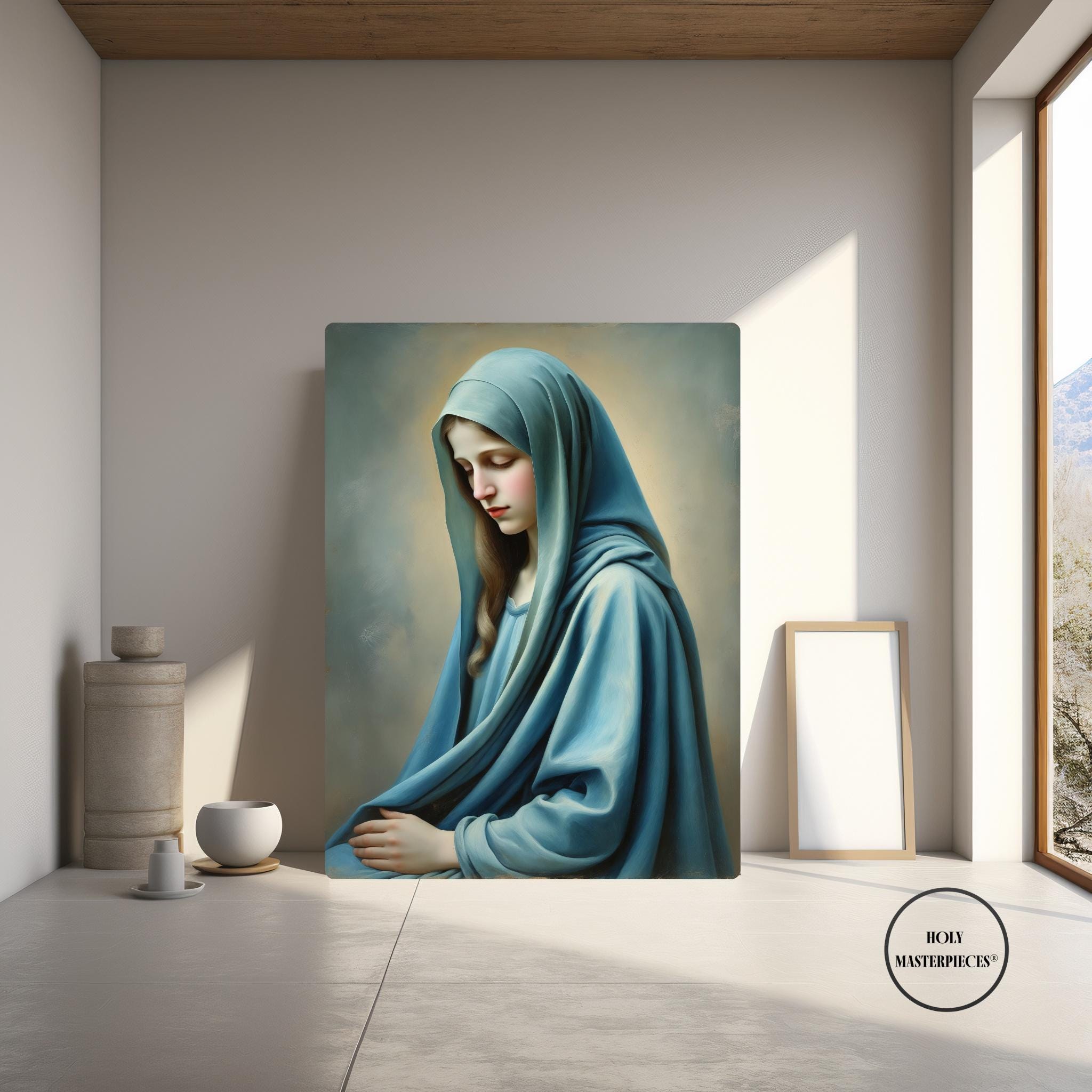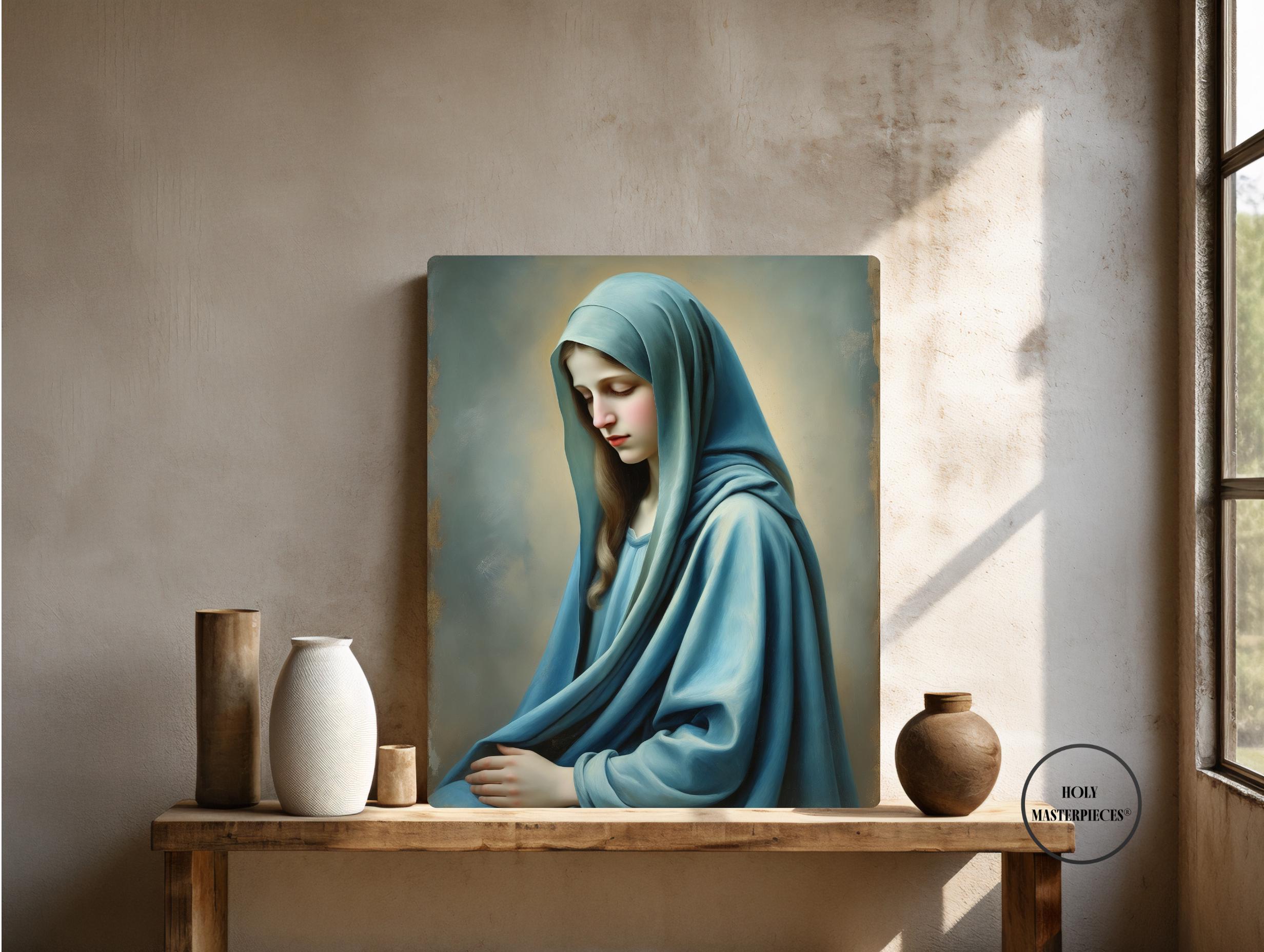 Virgin of the Aquamarine Veil presents the Blessed Virgin Mary in a serene half-length portrait, her head gently inclined and eyes lowered in quiet contemplation. An aquamarine veil flows softly around her head and shoulders, its cool blue-green tone evoking purity, calm, and spiritual depth. This Catholic Marian wall art centers on humility, silence, and inward prayer rather than dramatic gesture.