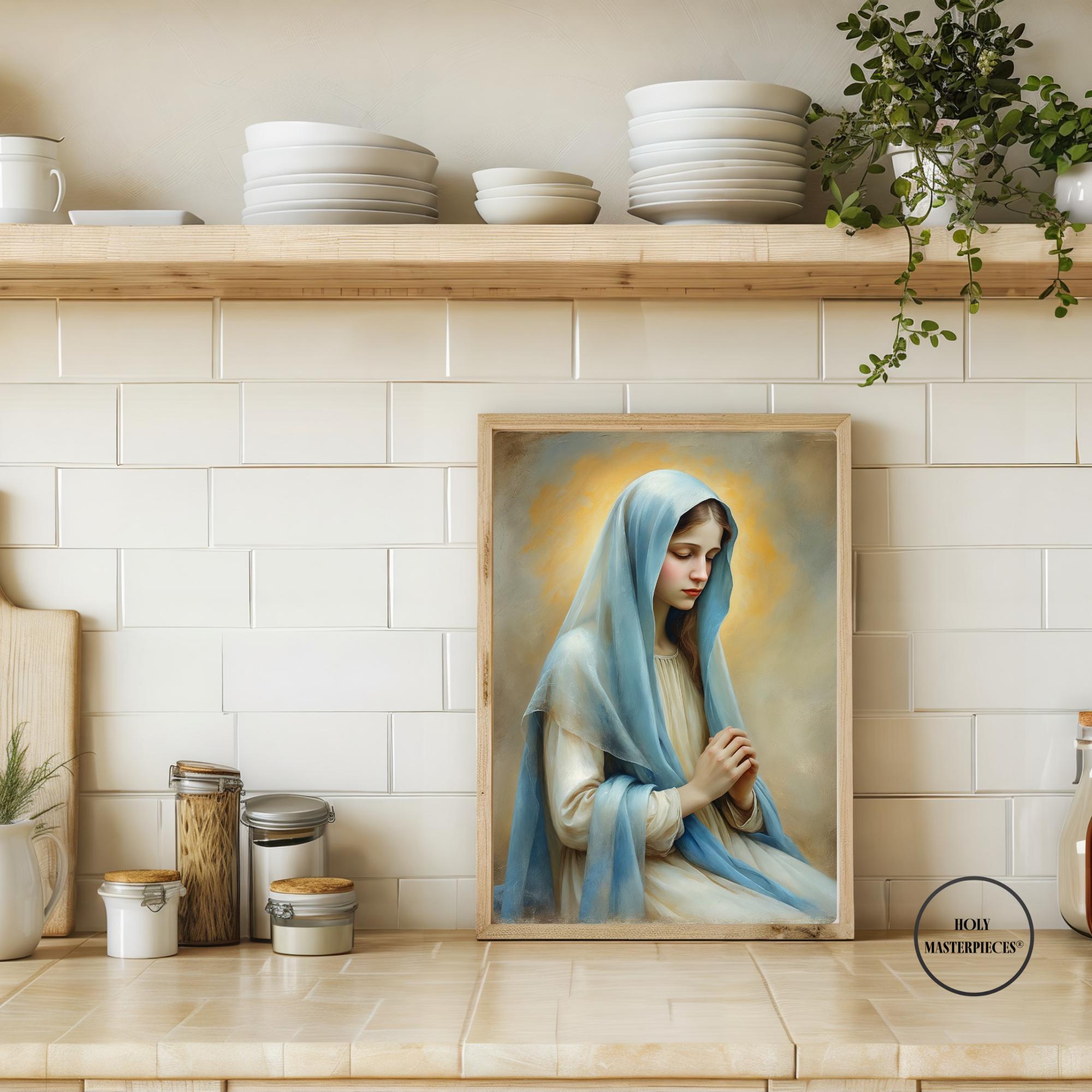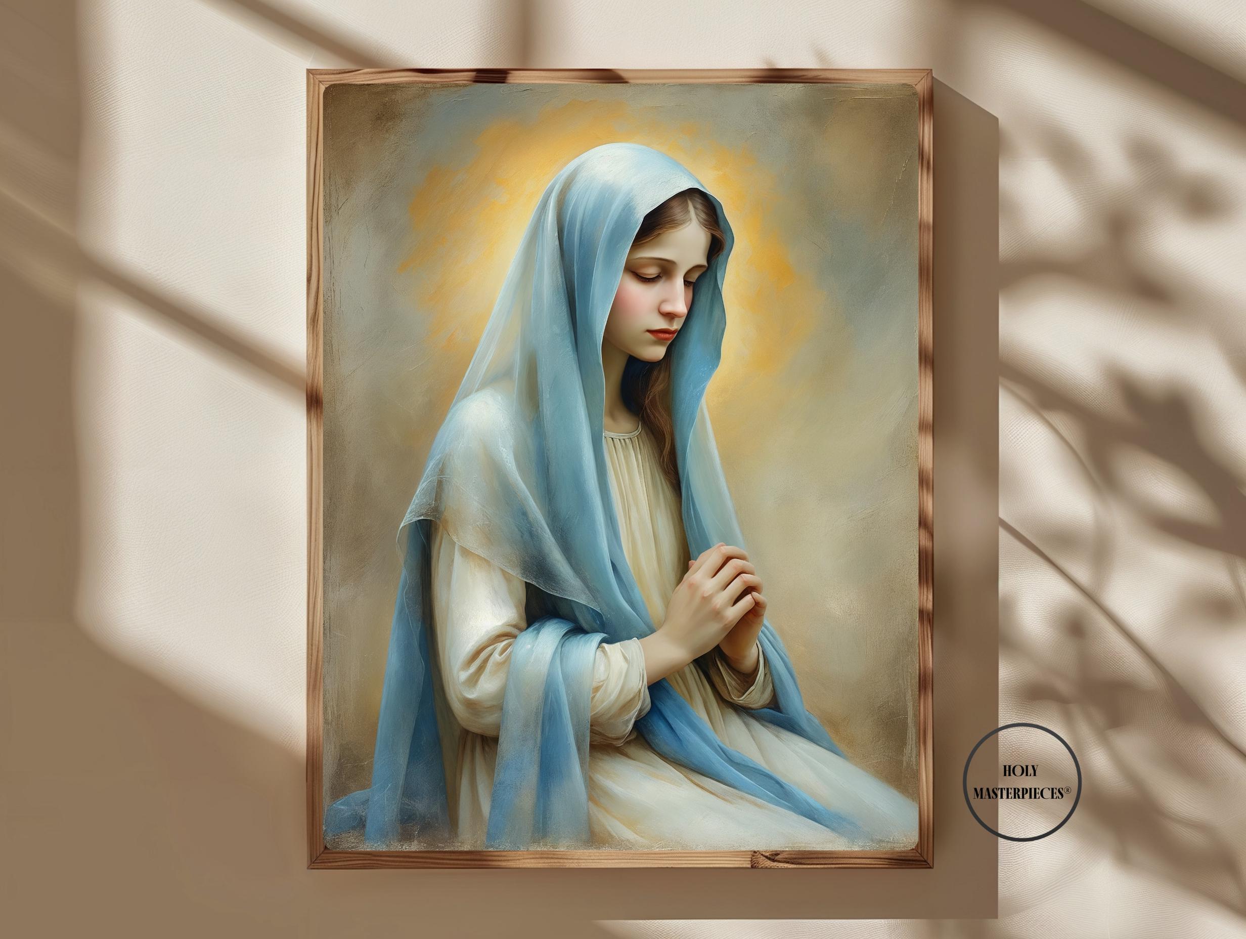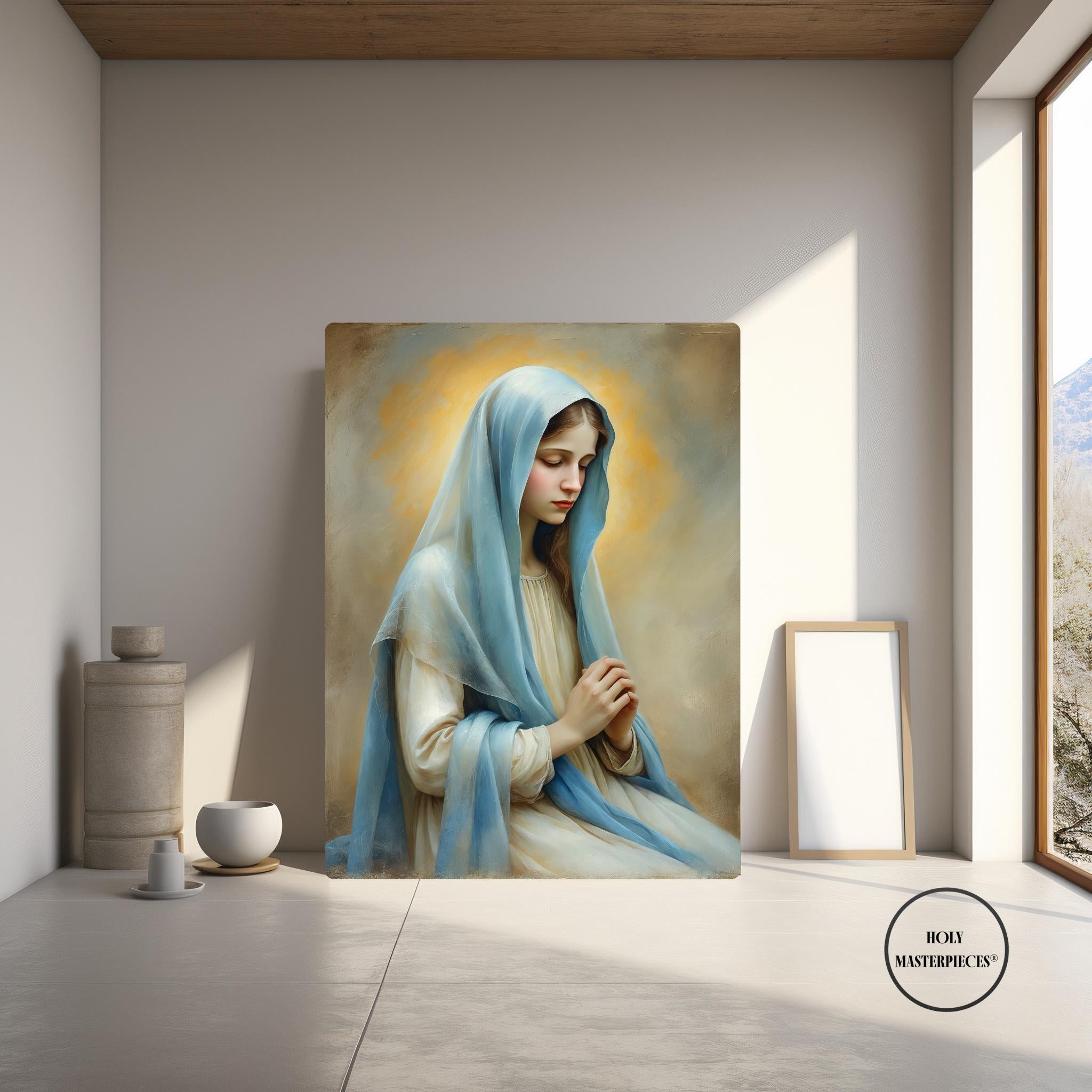Inspired by classical 17th-century Western sacred oil painting, the artwork features softened edges, refined brushwork, and smooth tonal transitions. The museum-like finish and calm visual language make this piece especially suited for prayer rooms, chapels, bedrooms, and contemplative Marian spaces within Catholic homes.
