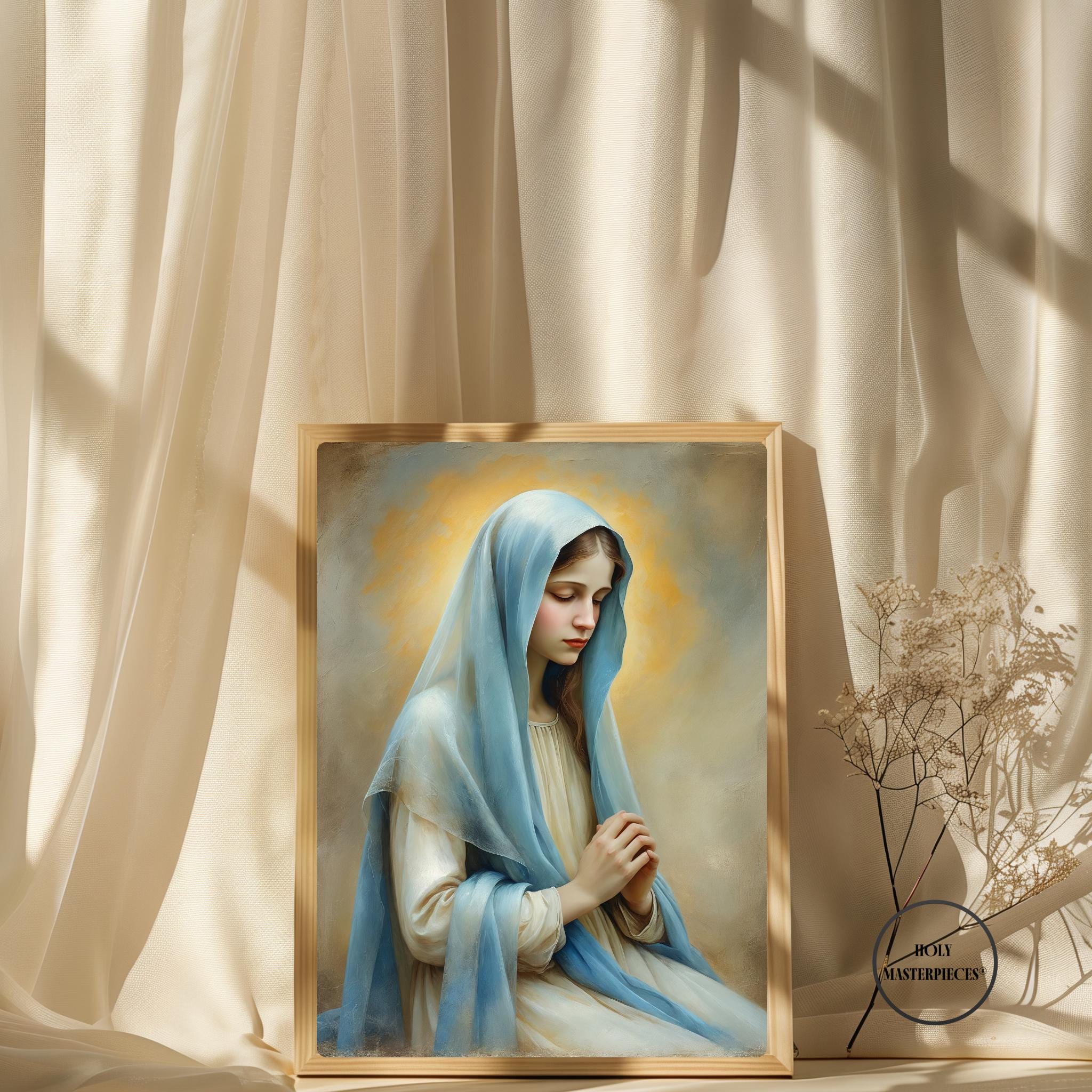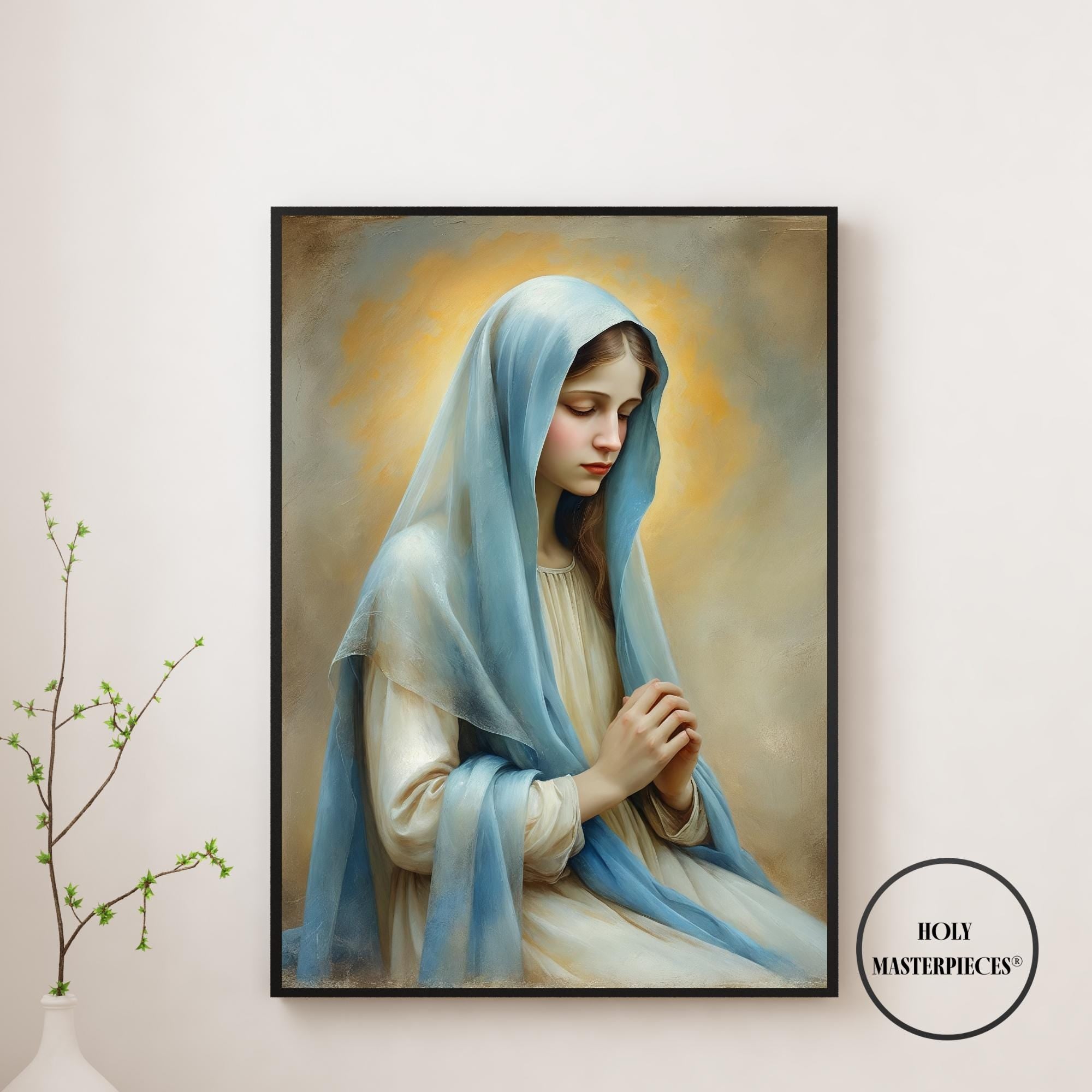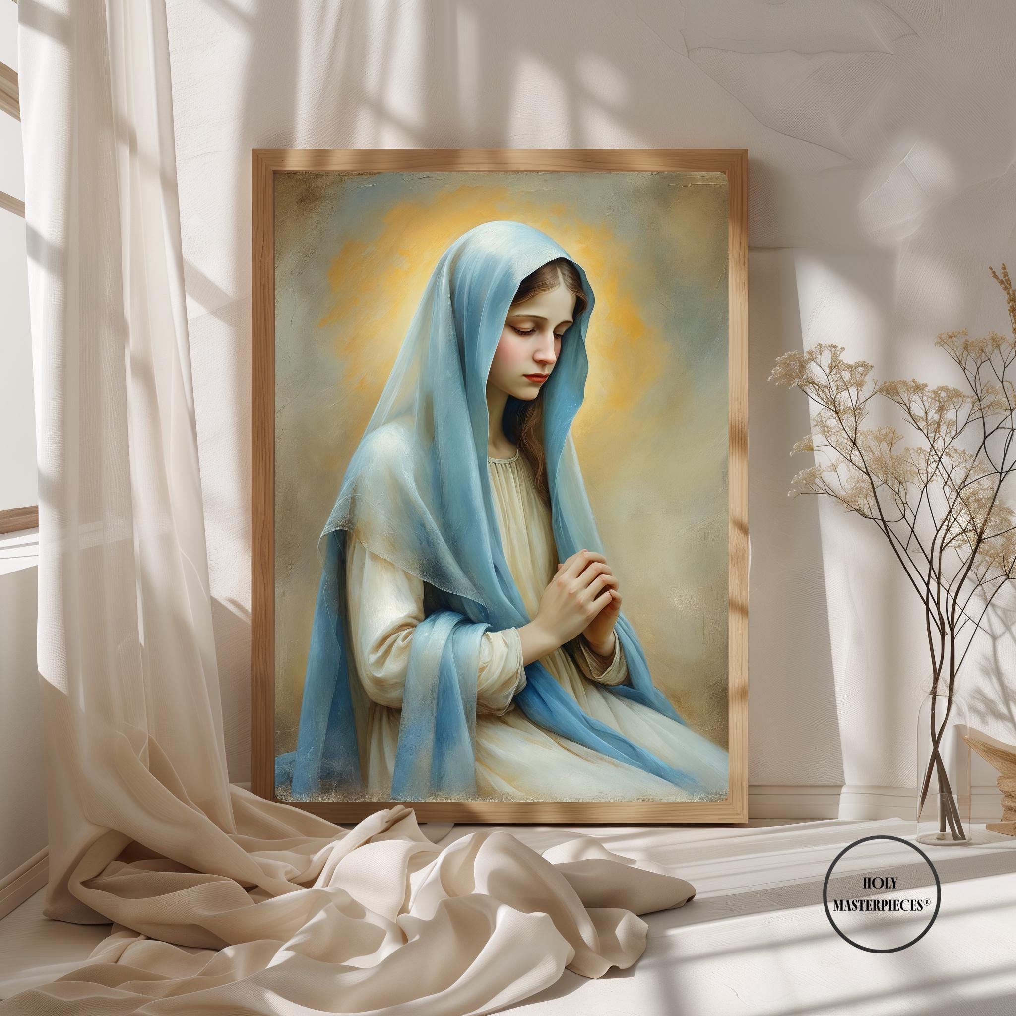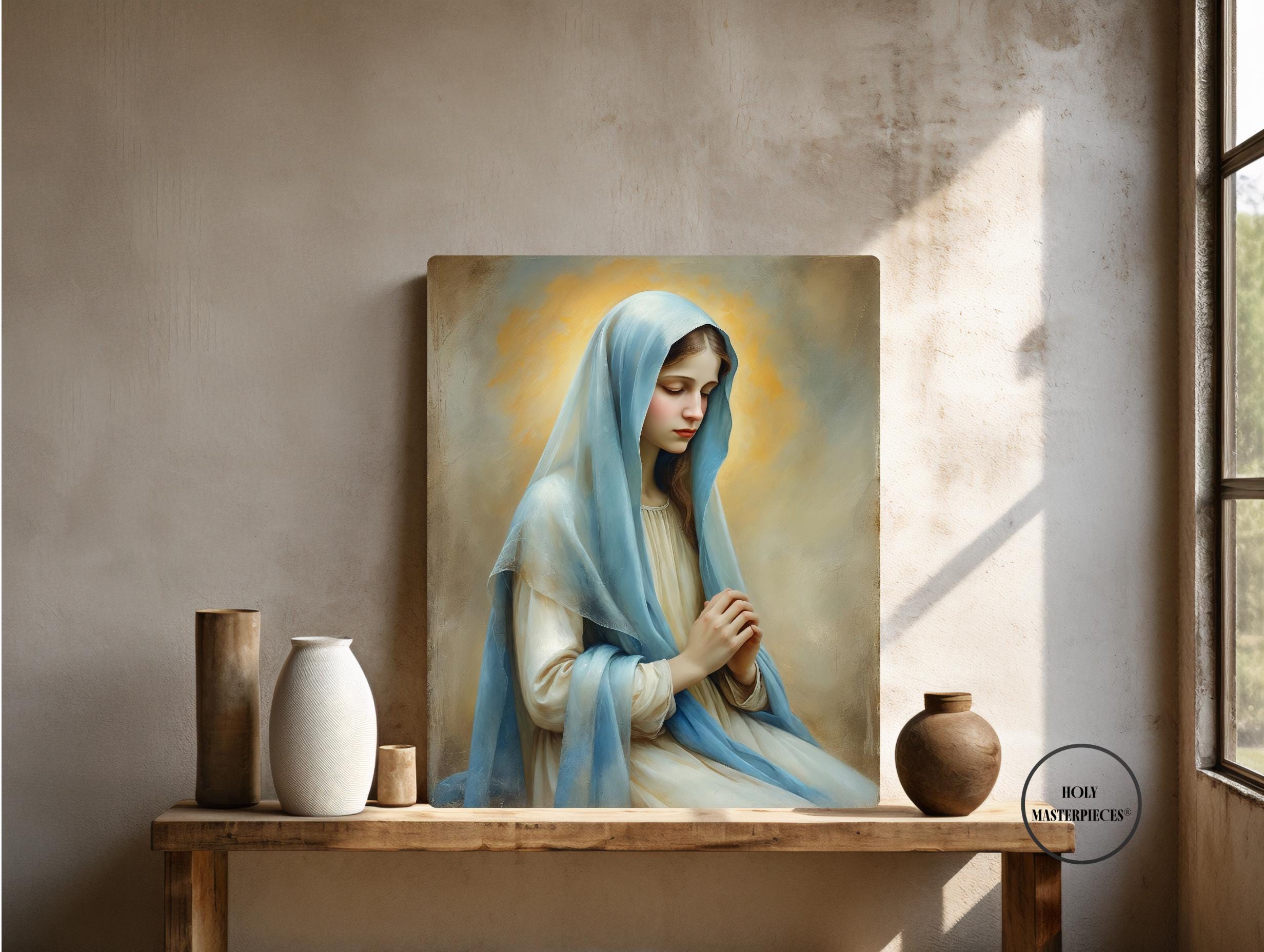 Inspired by classical 17th-century Western sacred oil painting, the artwork features softened edges, refined brushwork, and smooth tonal transitions. The museum-like finish and calm visual language make this piece especially suited for prayer rooms, chapels, bedrooms, and contemplative Marian spaces within Catholic homes.