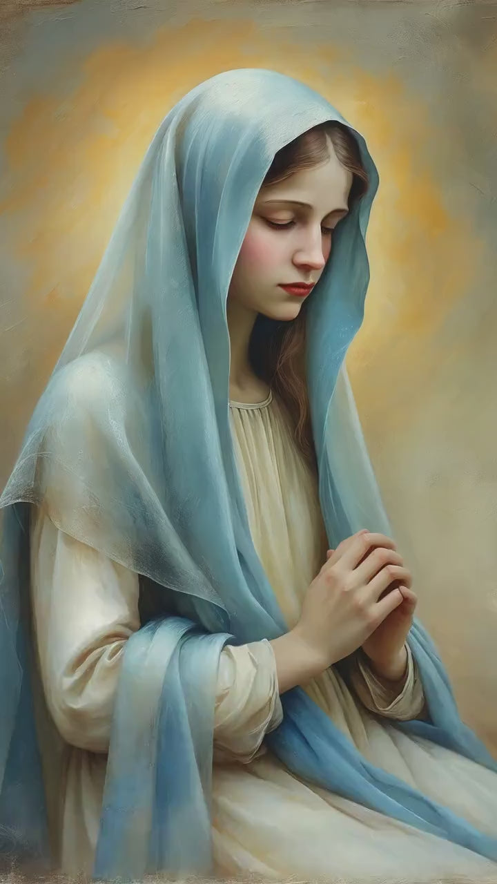 Her hands are gently gathered together, reinforcing a posture of devotion and inward reflection. The airy blue veil contrasts delicately with her ivory garments, creating a balanced and harmonious palette. Subtle chiaroscuro lighting shapes her features and flowing fabric with painterly restraint, while a warm halo glow and muted background preserve a timeless devotional atmosphere.