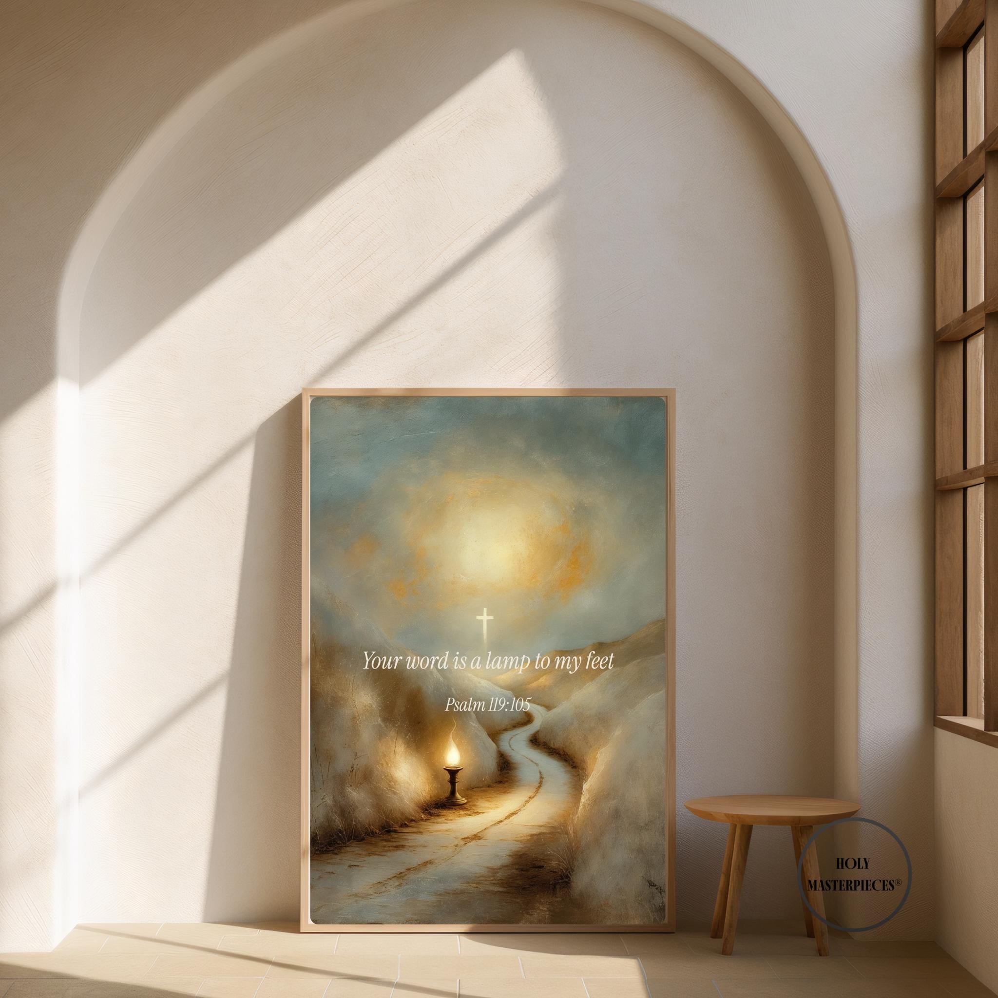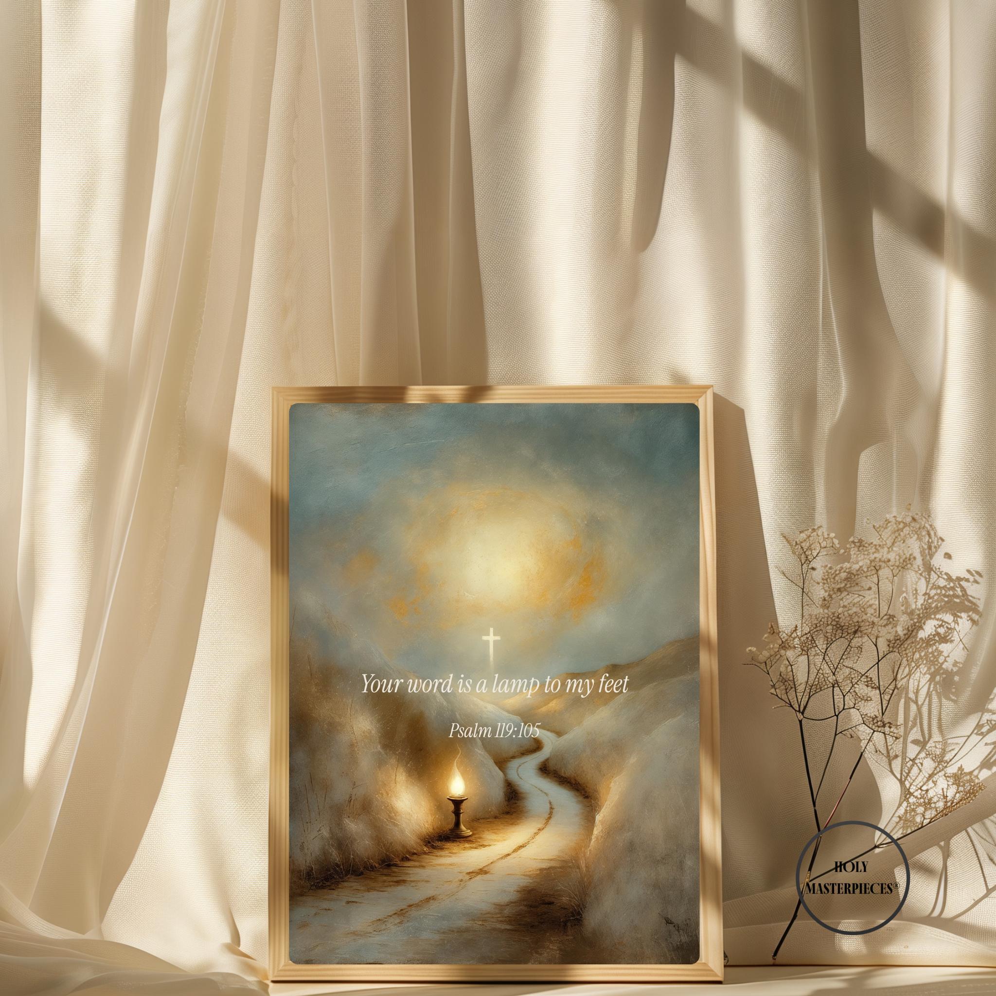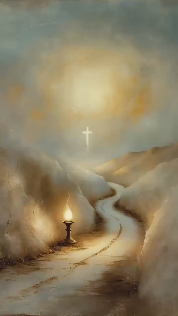 This contemplative scripture artwork is inspired by Psalm 119:105, presenting a quiet and reverent visual meditation on divine guidance, clarity, and trust in God’s word. The composition features a symbolic scene of light illuminating a path in surrounding darkness, rendered in a classical sacred style with softened brushwork and gentle illumination. The scene is intentionally restrained, allowing space for reflection, direction, and prayer.