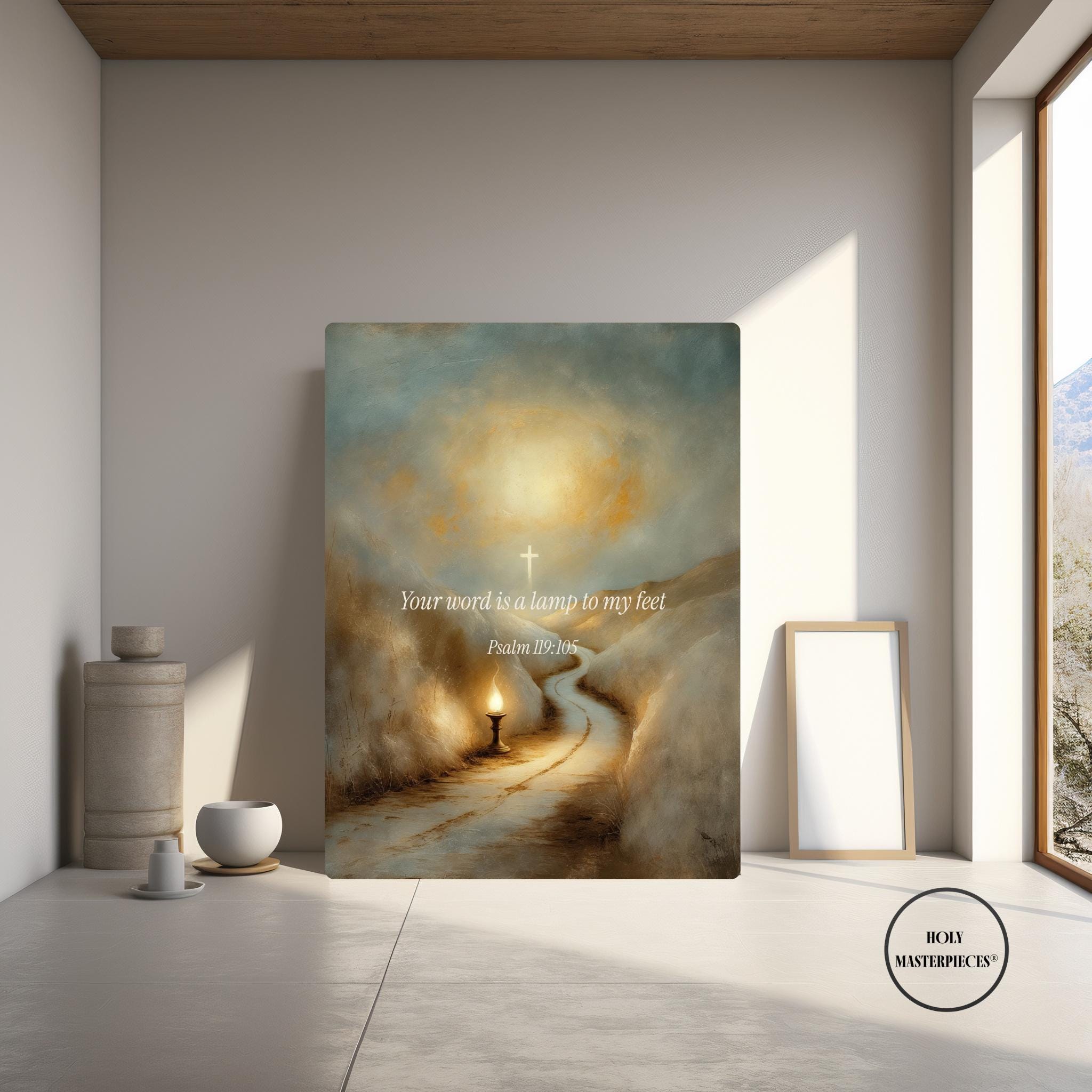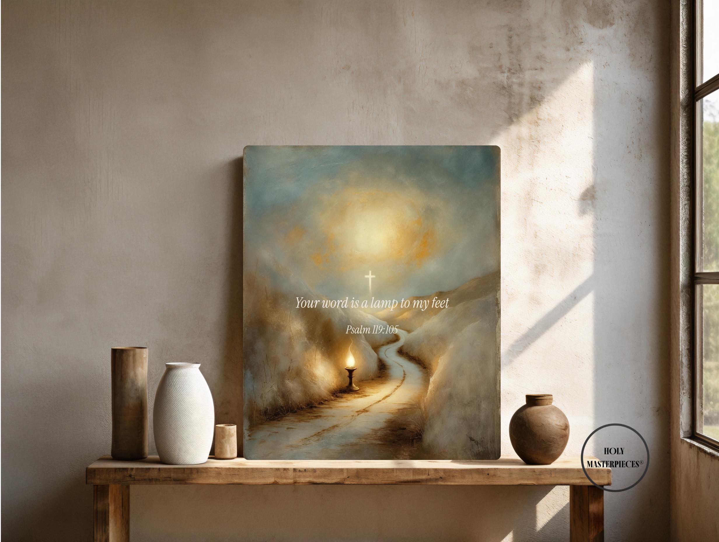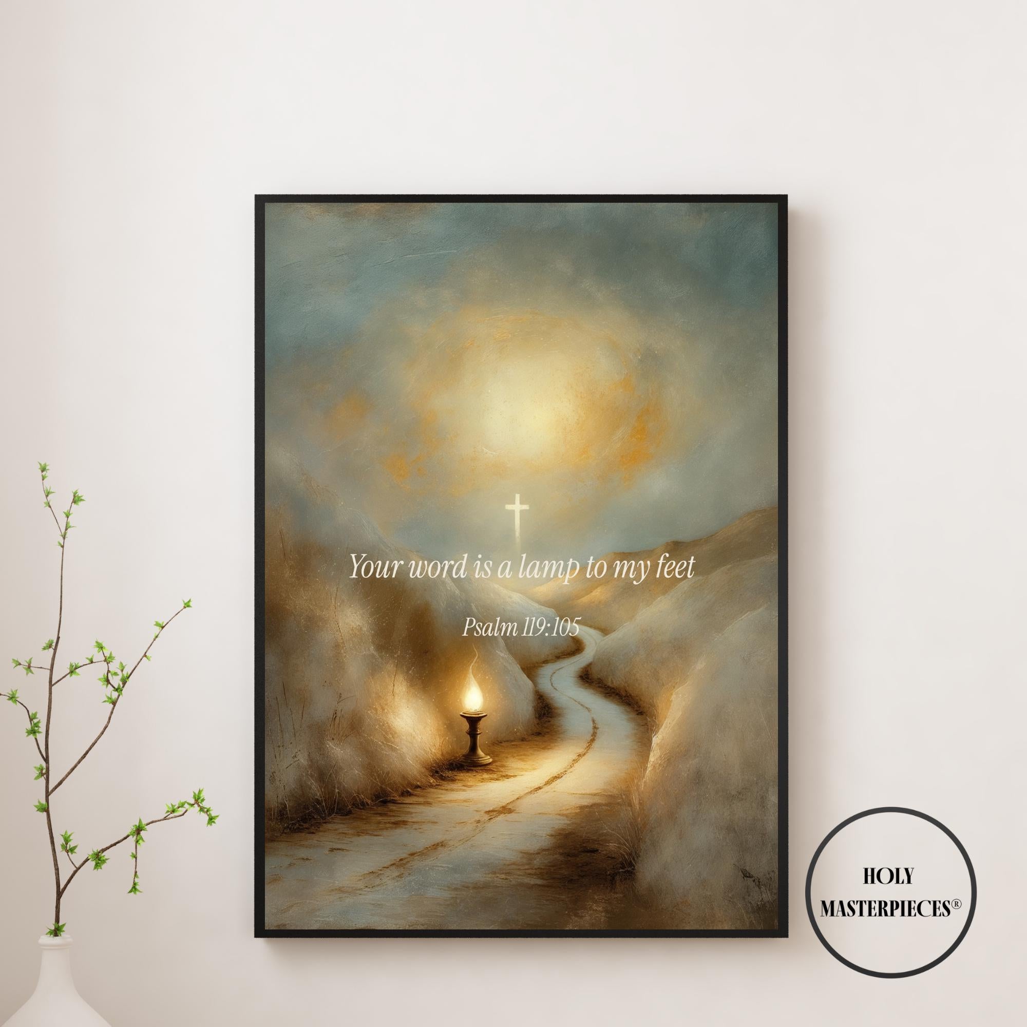This contemplative scripture artwork is inspired by Psalm 119:105, presenting a quiet and reverent visual meditation on divine guidance, clarity, and trust in God’s word. The composition features a symbolic scene of light illuminating a path in surrounding darkness, rendered in a classical sacred style with softened brushwork and gentle illumination. The scene is intentionally restrained, allowing space for reflection, direction, and prayer.
