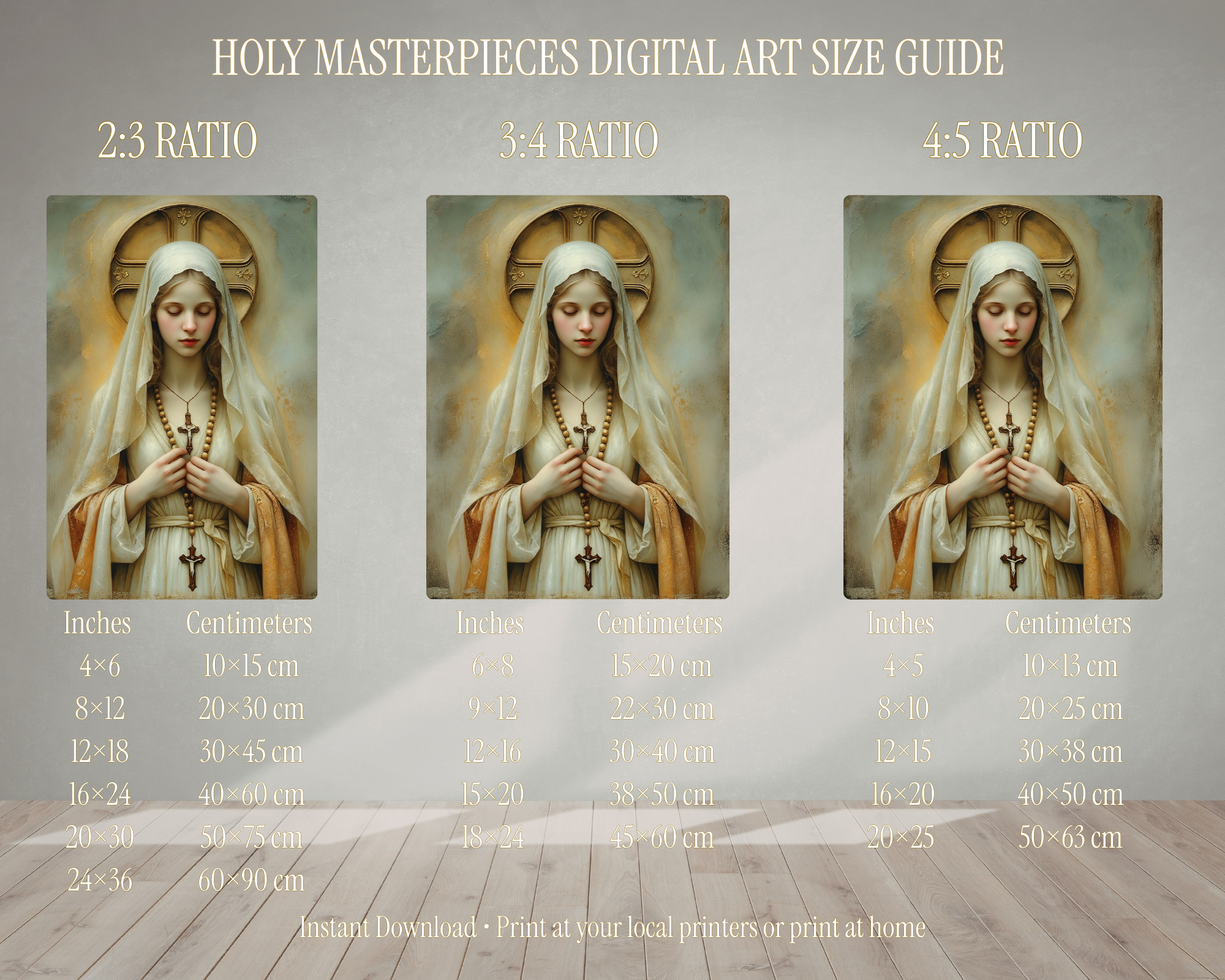 Inches: 4×5, 8×10, 12×15, 16×20, 20×25